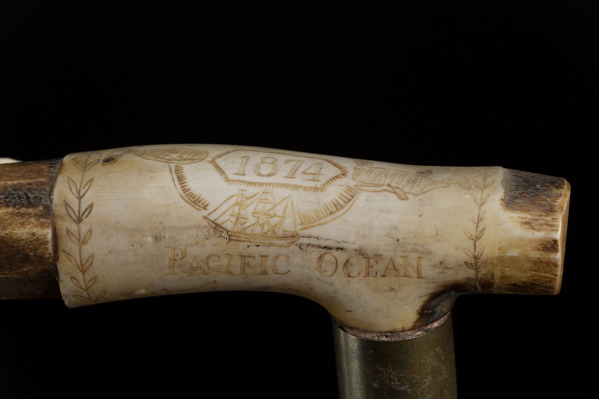 - Impugnatura ad L in osso con scritte di natura marina. Asta in legno. Puntale in ferro.