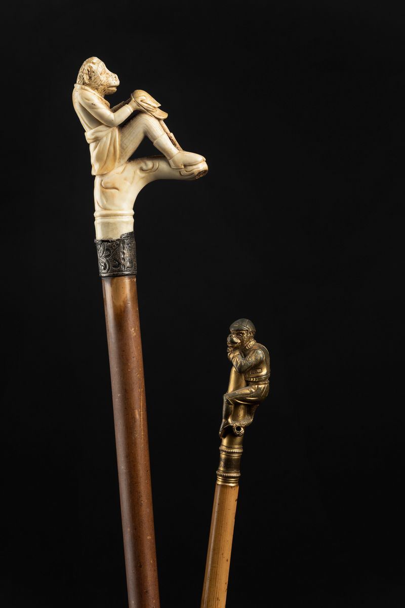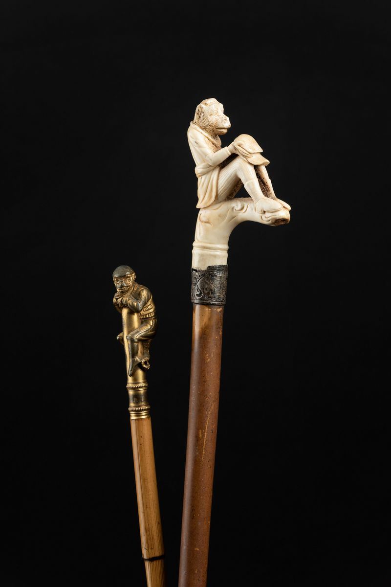- Impugnatura ad L scolpita in avorio con macaco a sembianze umane che legge il giornale. Asta in malacca, collarino in metallo decorato.