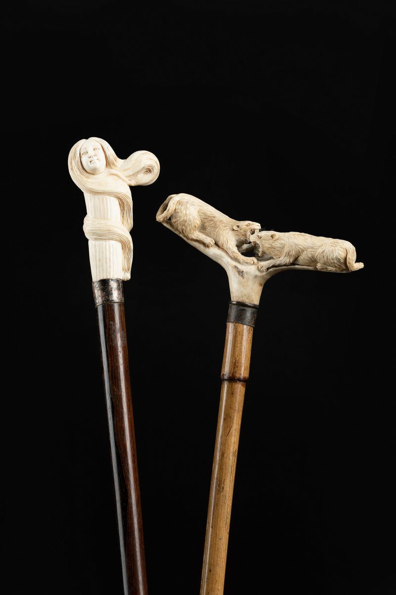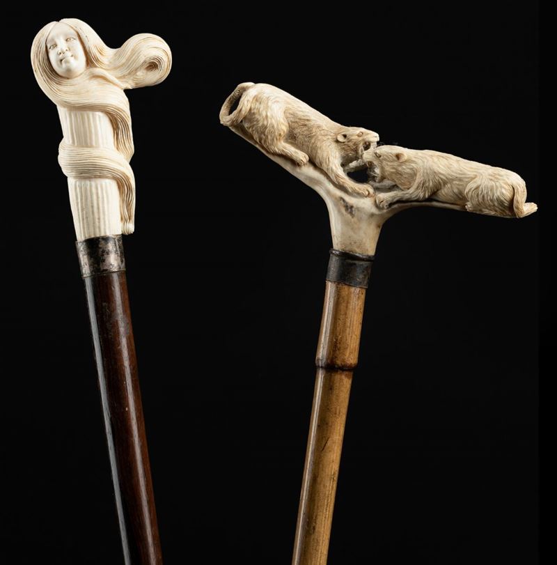 Lotto composto due bastoni da passeggio con impugnatura in osso, Manifattura europea, fine XIX-inizi XX secolo