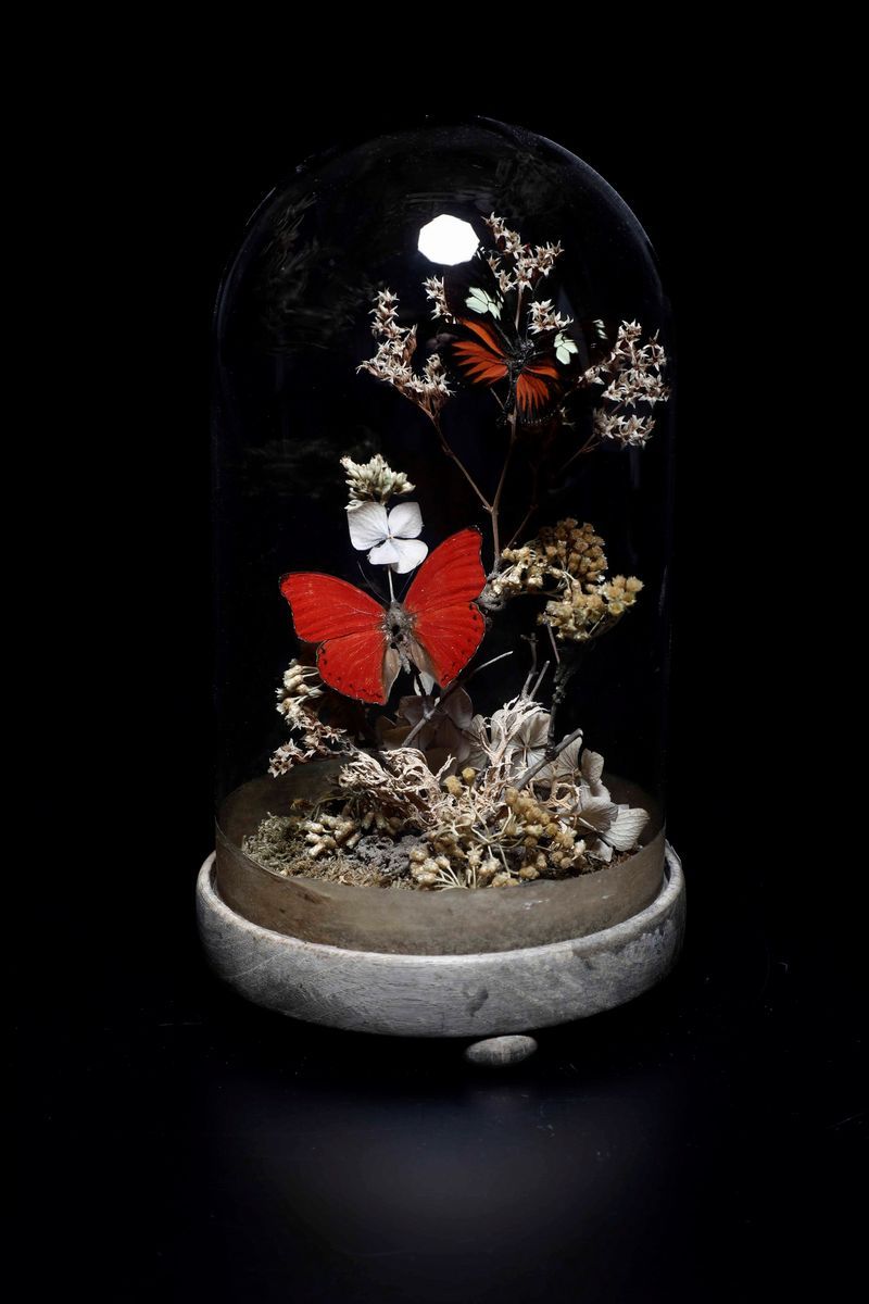 Diorama with butterflies within a glass case
