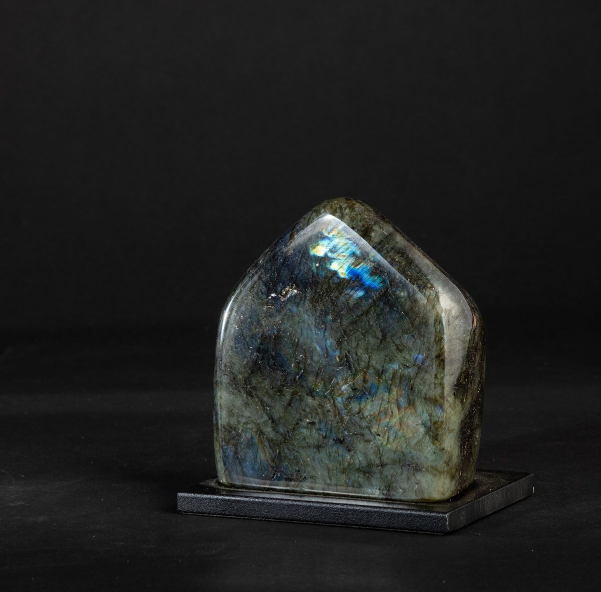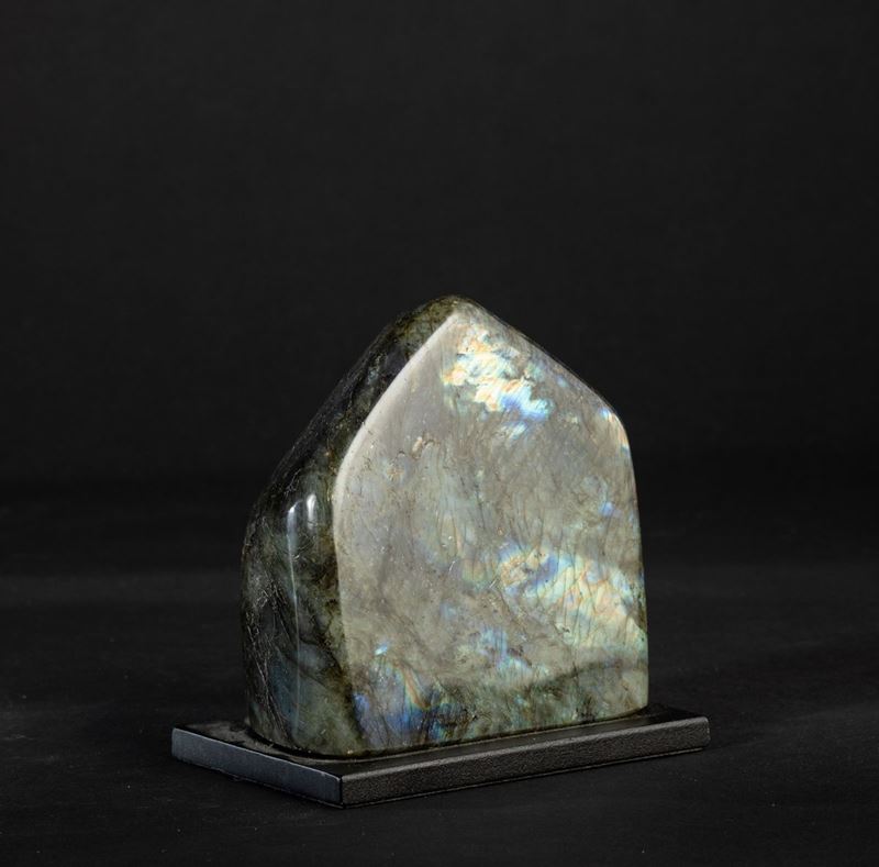 A medium-sized labradorite on a black base. It is a variety of anortite with colours ranging from green to blue, used in jewelry-making.