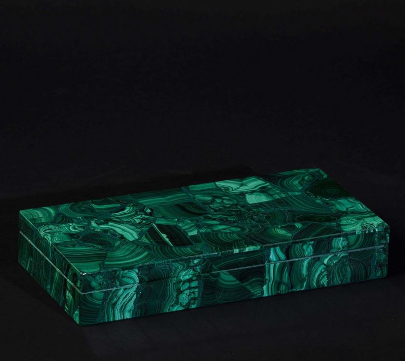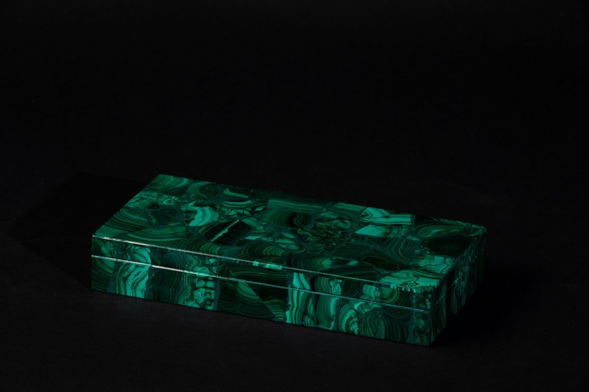 Mosaic-tiled malachite chest with marble interiors, 21st century