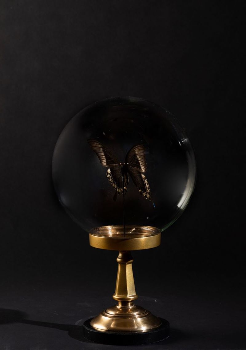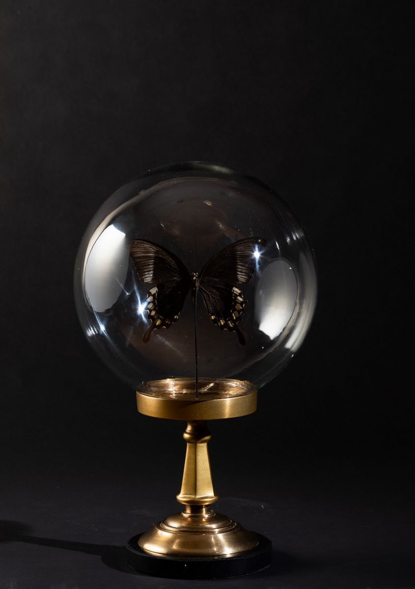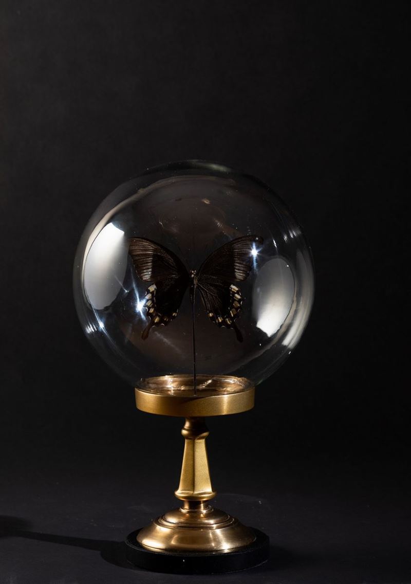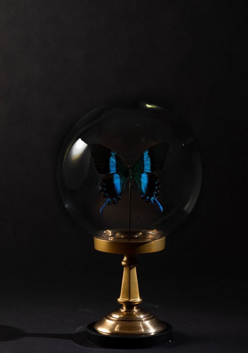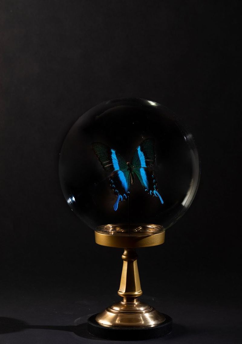Papilio Blumei is a diurnal butterfly with green wings shifting into blue on the tips. On a brass and marble base.