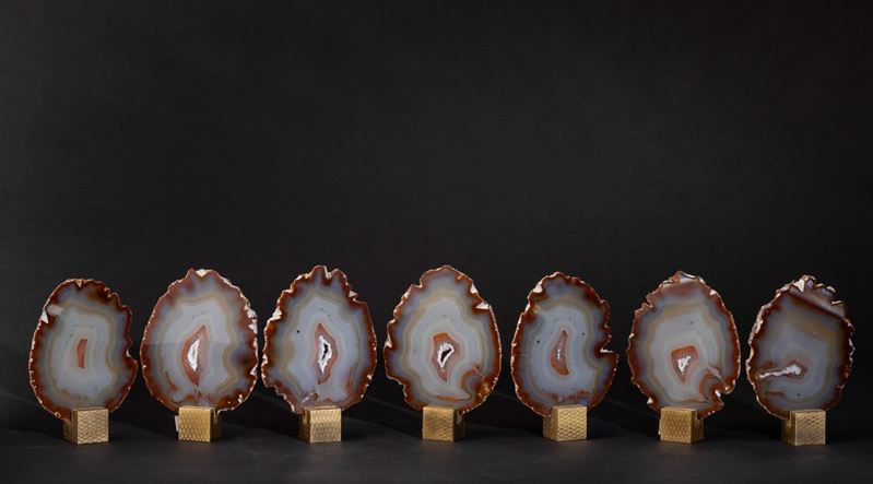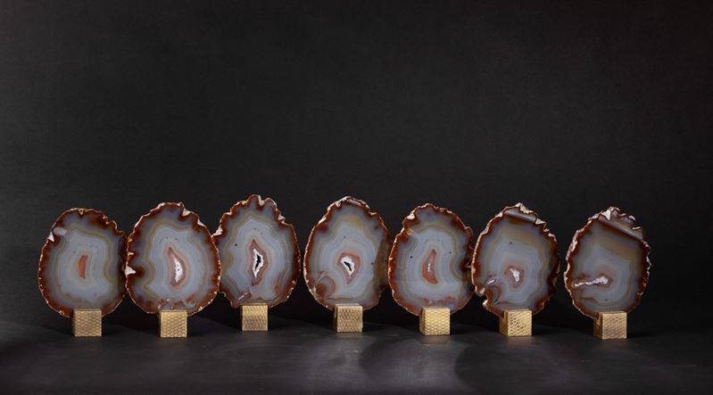 A series of 7 agate slices on cubical brass stands. Together, they recreate the patterns of this Brasilian stone.