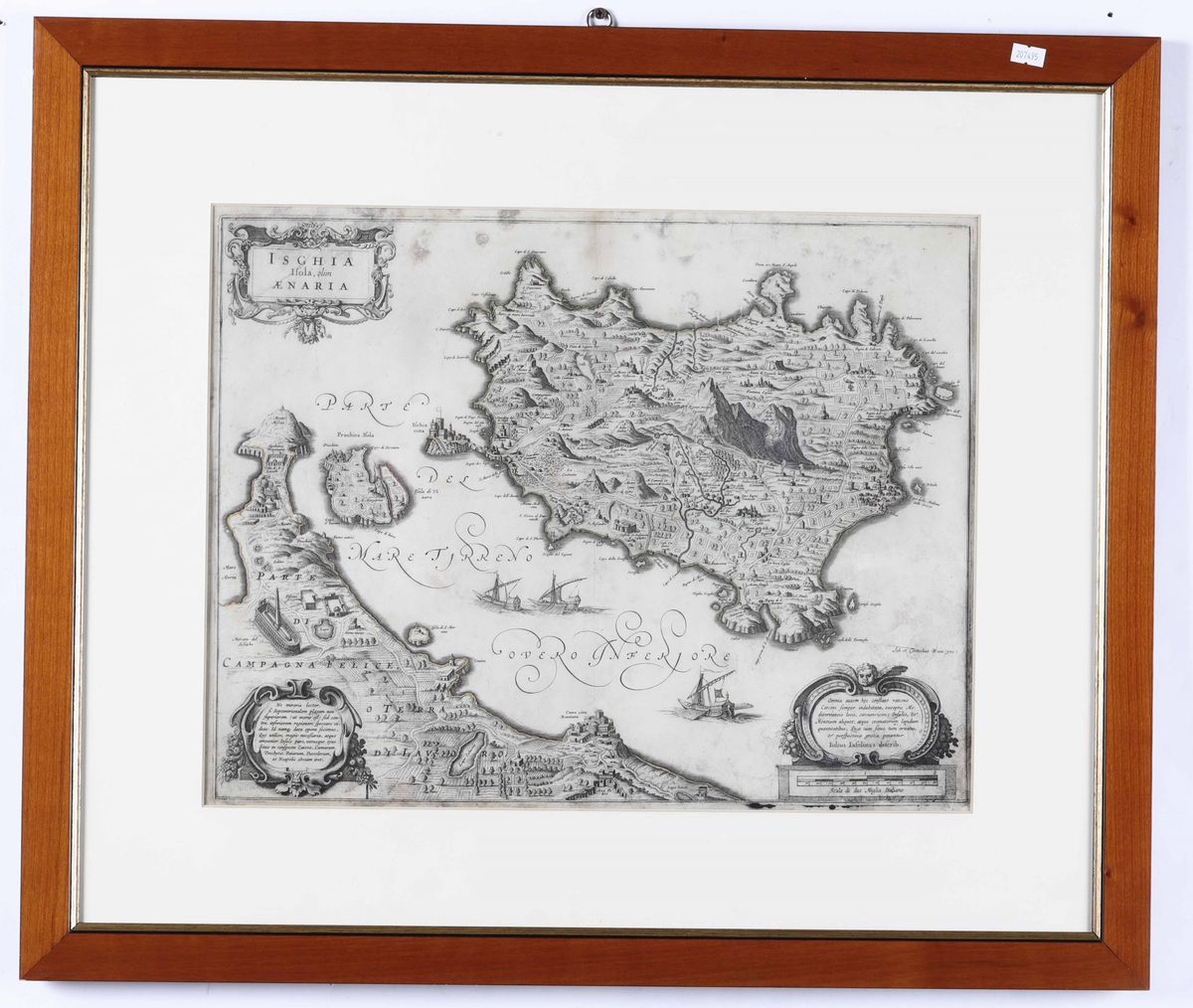 Lotto di due stampe raffiguranti cartina di Ischia e il ratto d'Europa, XVIII secolo