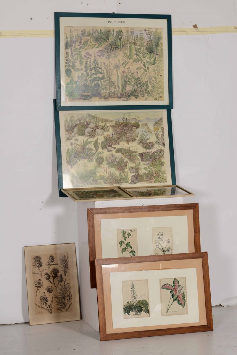 Lotto di stampe varie a soggetto floreale e storico, in cornice.
