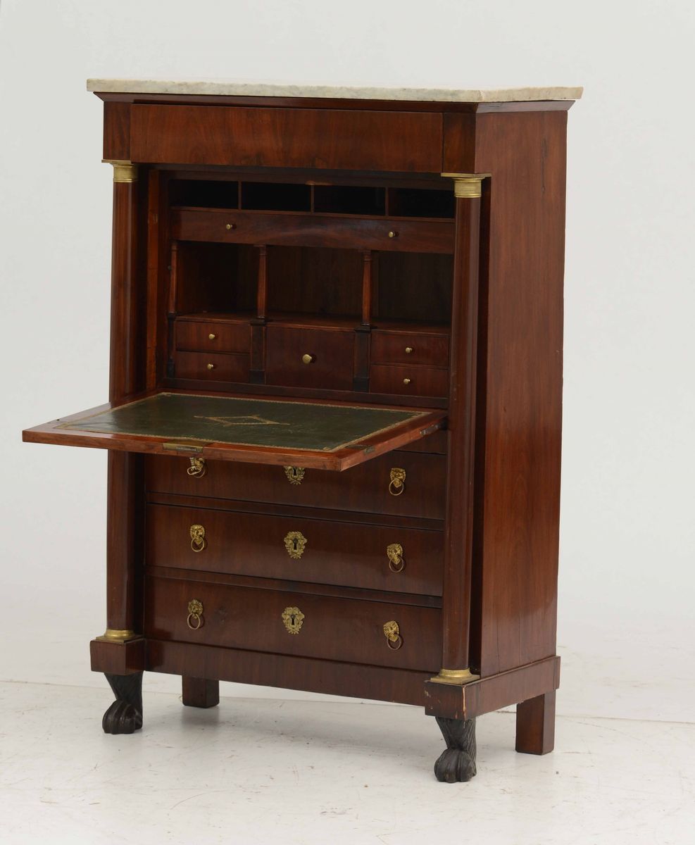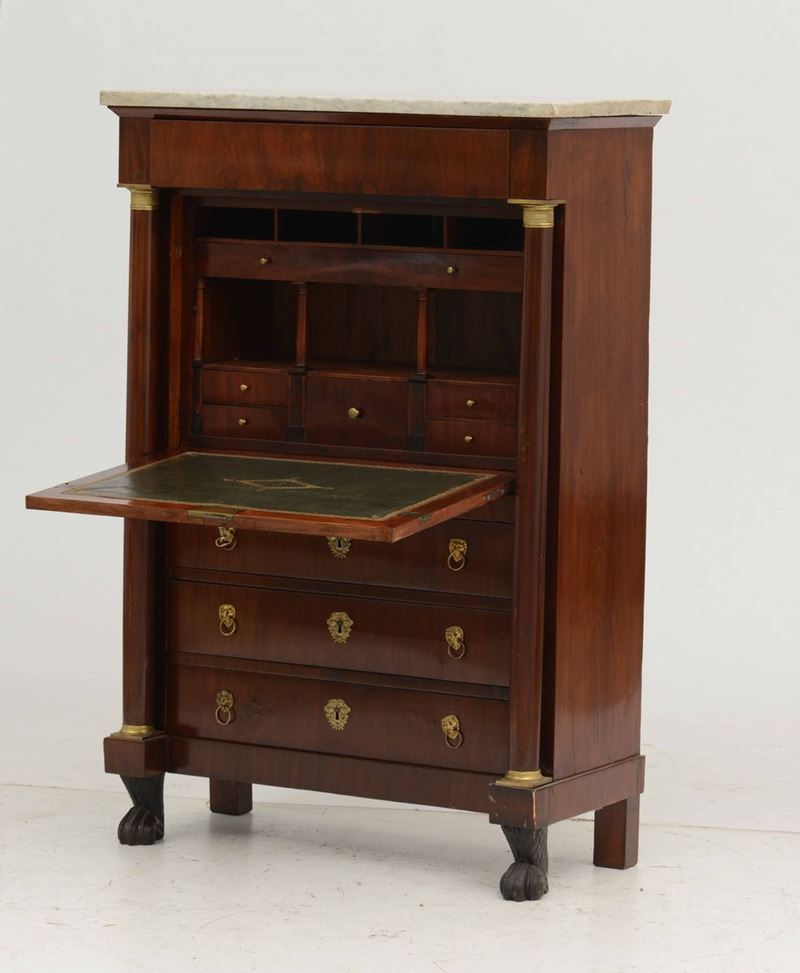 colonne sui montanti, tre cassetti alla base, piano in marmo, cm 100x46x148