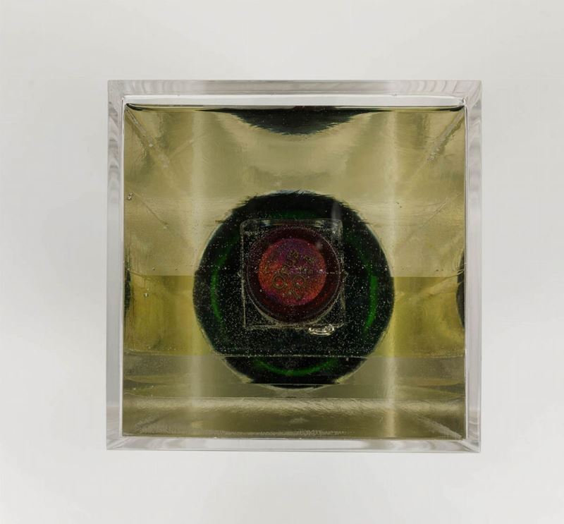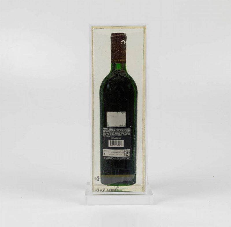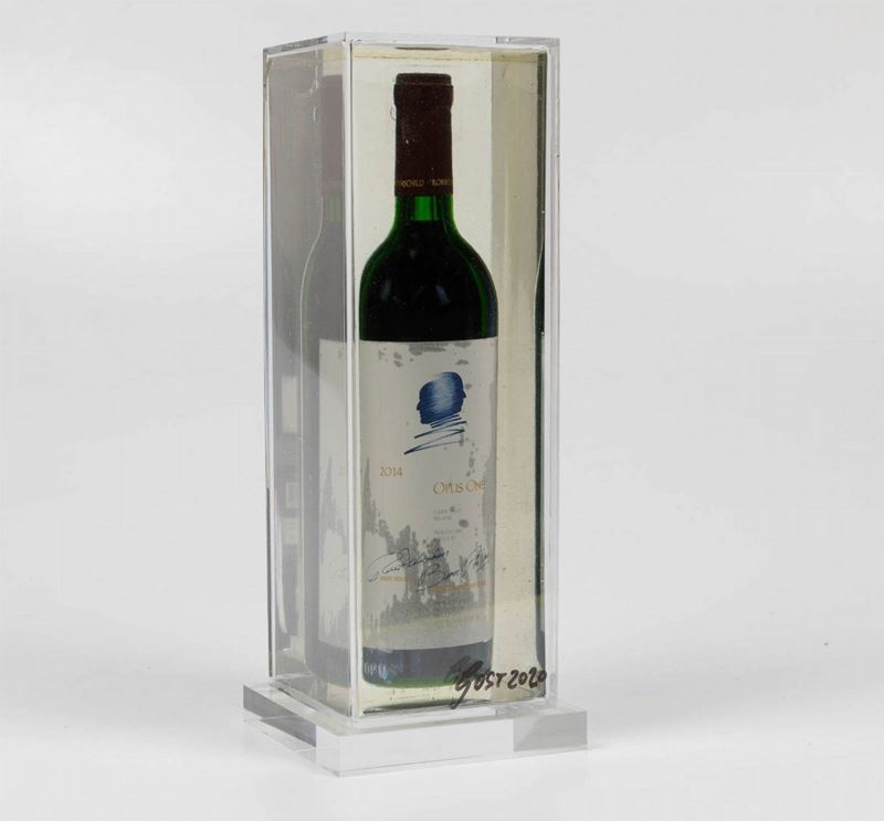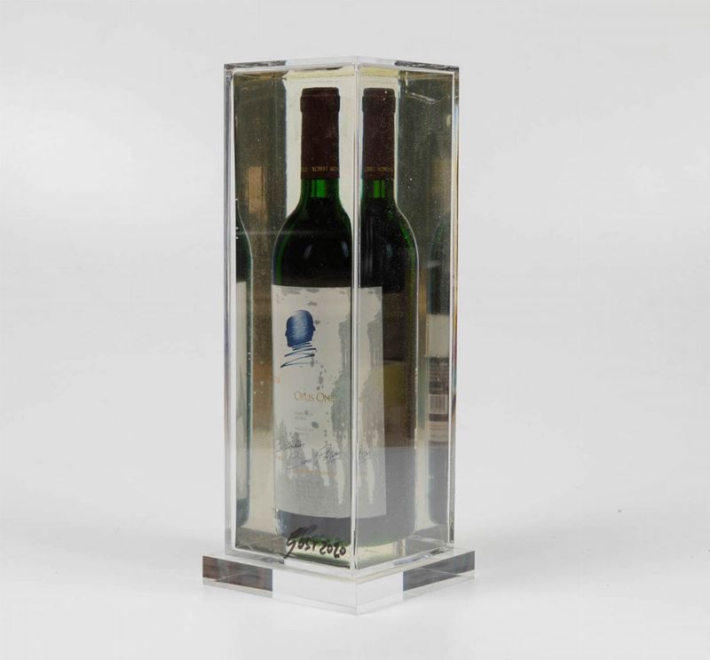 (etichetta e capsula in perfette condizioni) Giorgio Gost Titolo: Vino con resina Capsula del tempo di resina per l’anno 6.000; inclusione in resina di vino Opus One annata 2014; autentica dell’artista su fotografia con timbro a secco; opera registrata presso l’archivio dell’artista al numero 2000616; opera in eccellenti condizioni entro teca in plexiglass