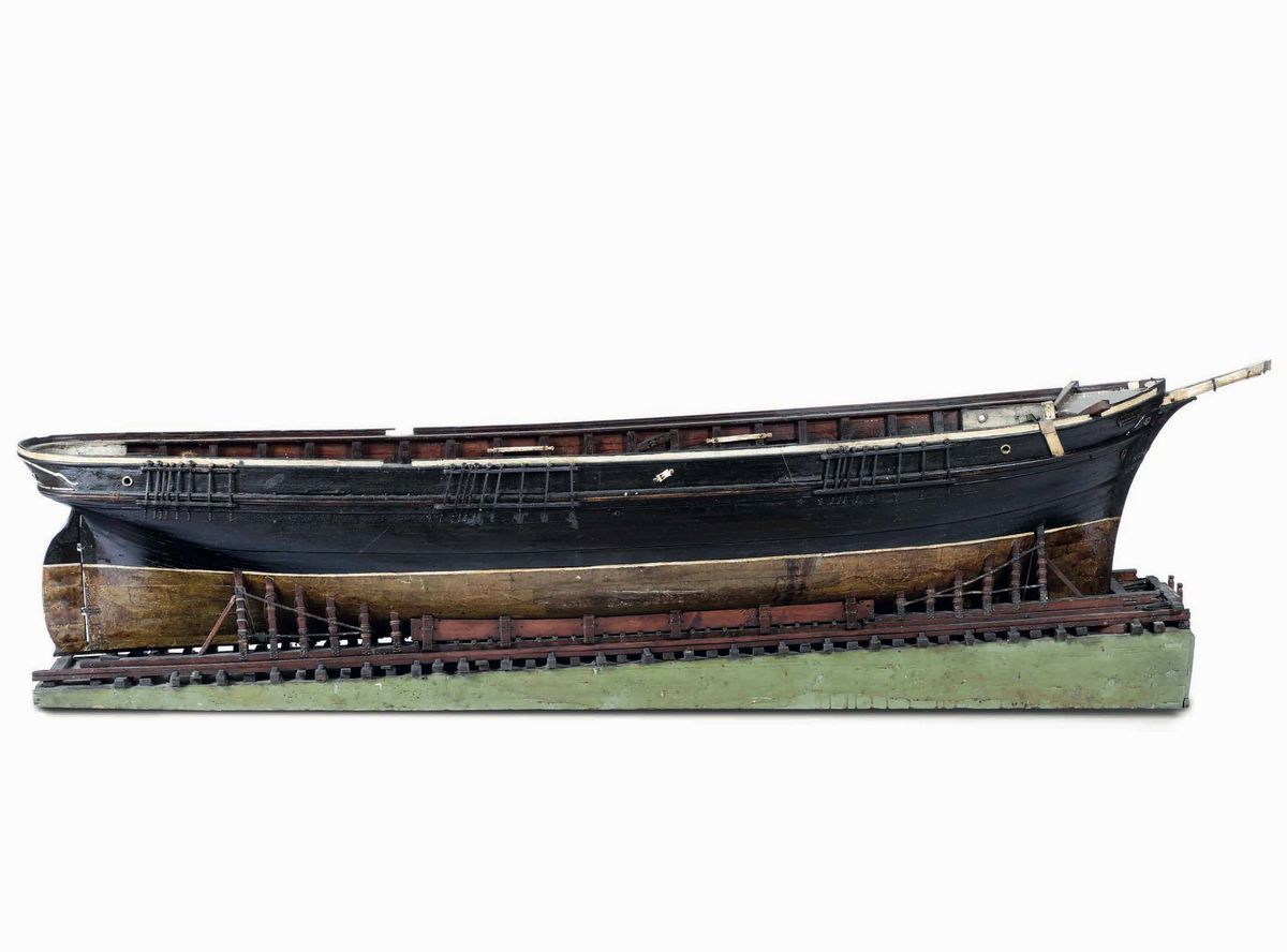 Raro monumentale modello di cantiere di brigantino su scivolo. Inizio XIX secolo