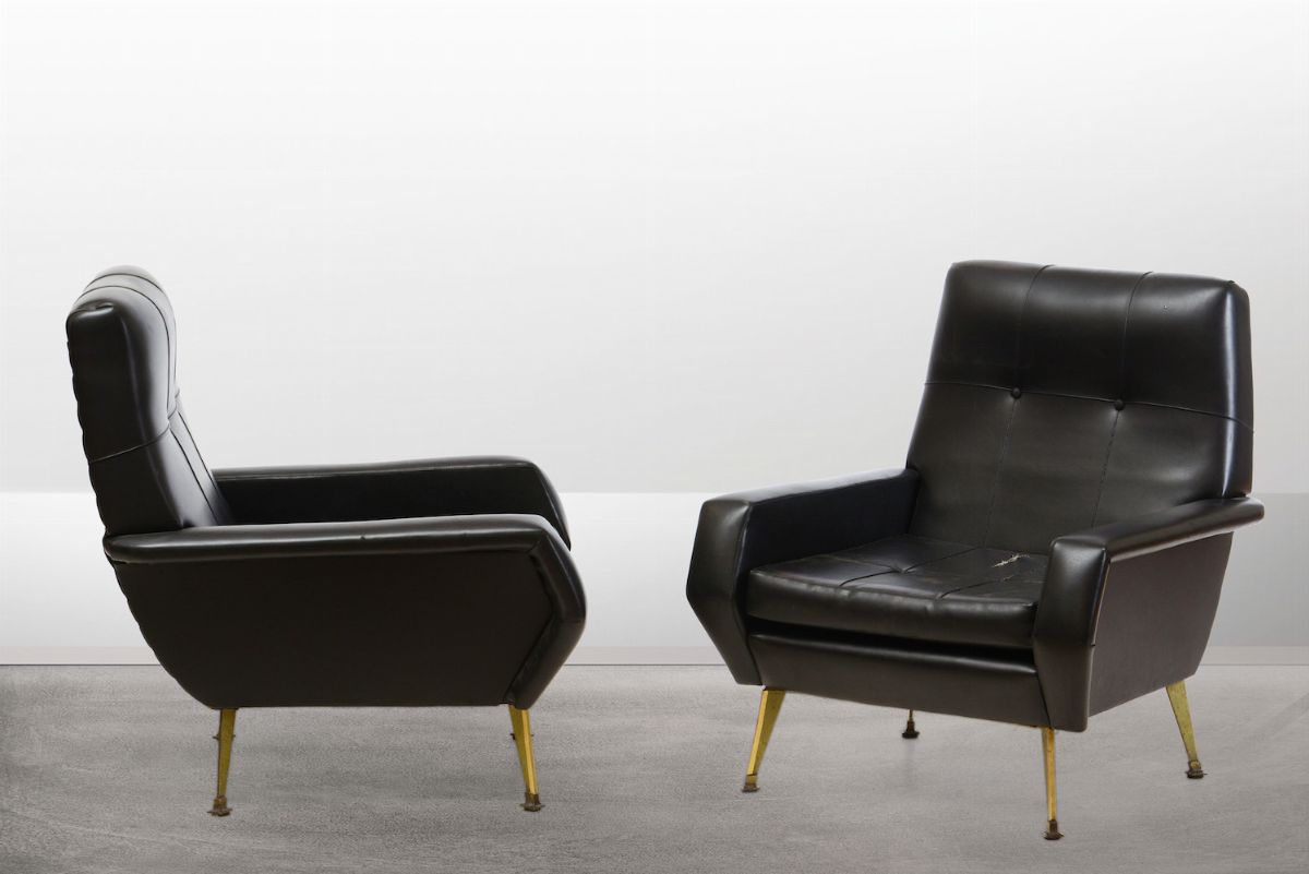 Coppia di poltrone con struttura in ottone e legno. Rivestimenti in skai.