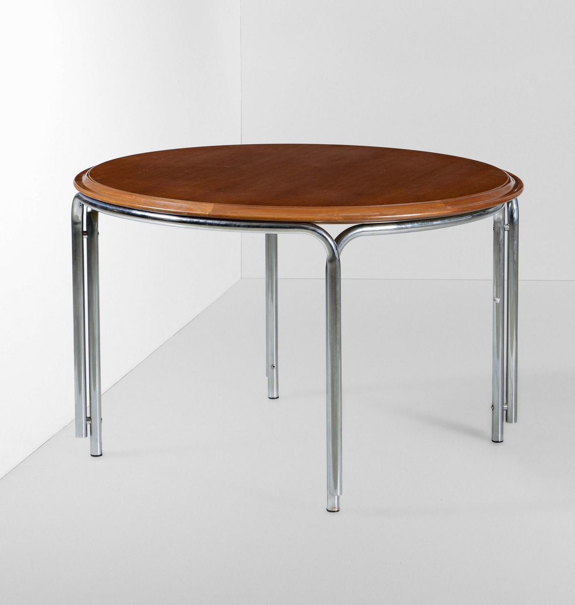 Tavolo con struttura in tubolare d'acciaio con piano in legno laminato.