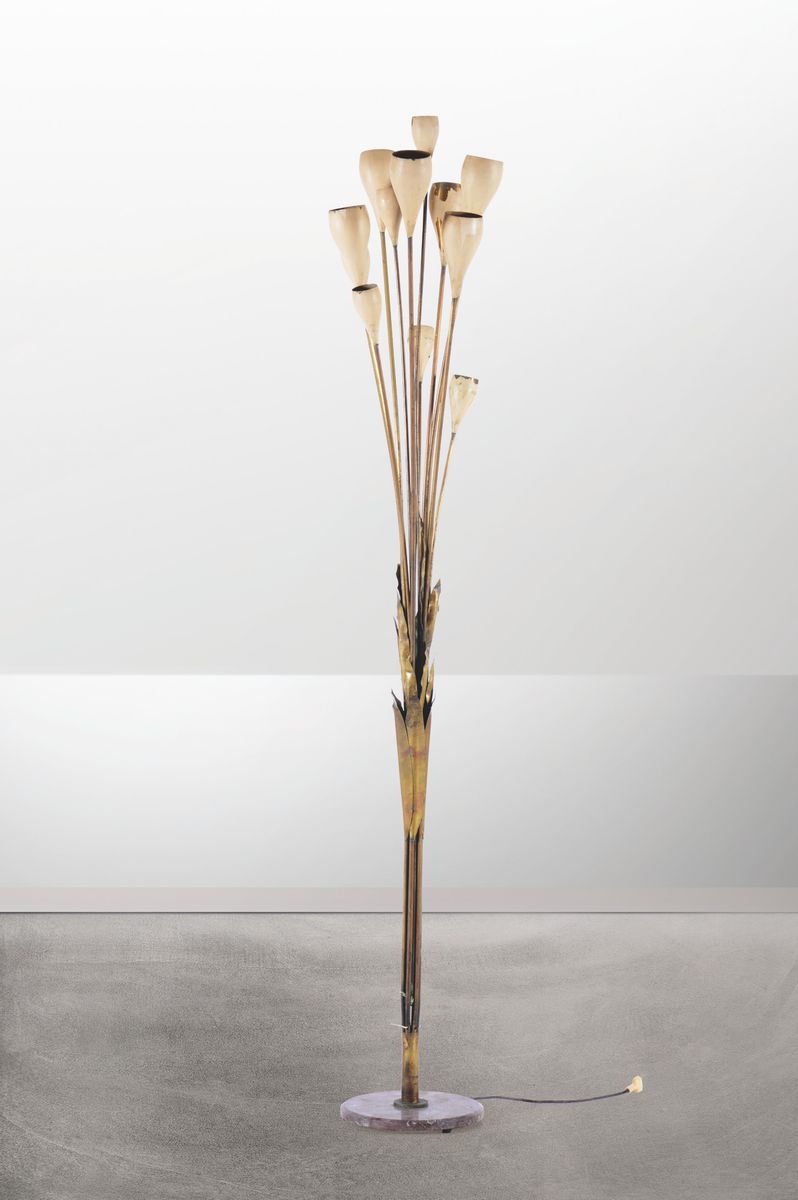 Lampada da terra con struttura e base in ottone, diffusori in ottone laccato.