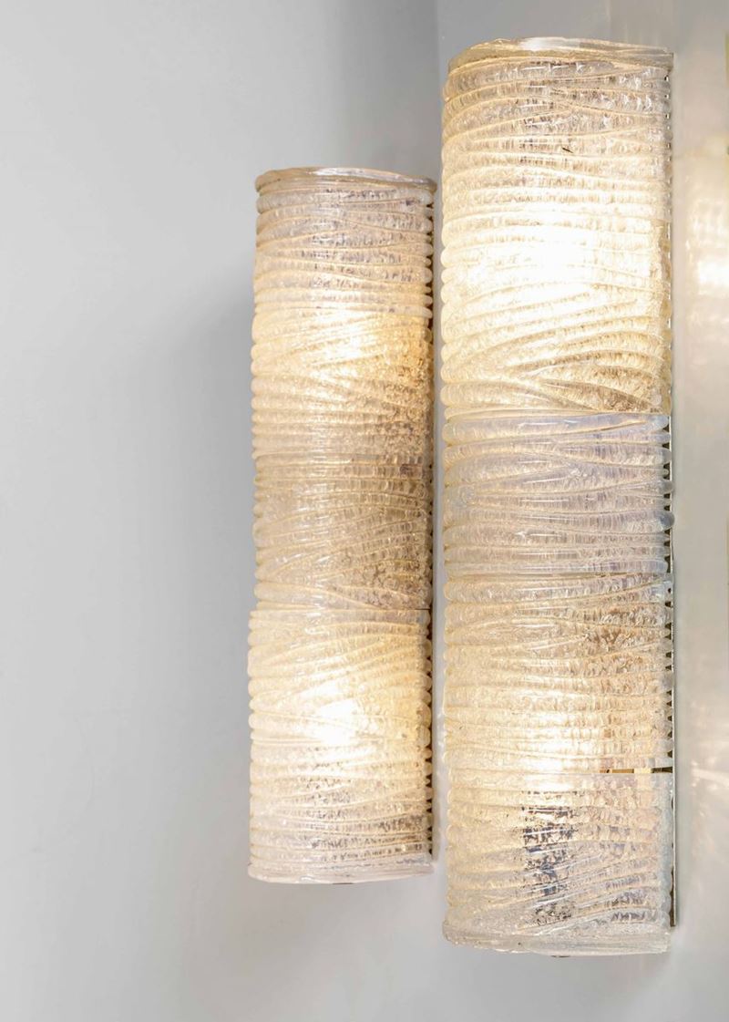Coppia di lampade da parete o a soffitto con struttura in metallo e diffusori in vetro di Murano.