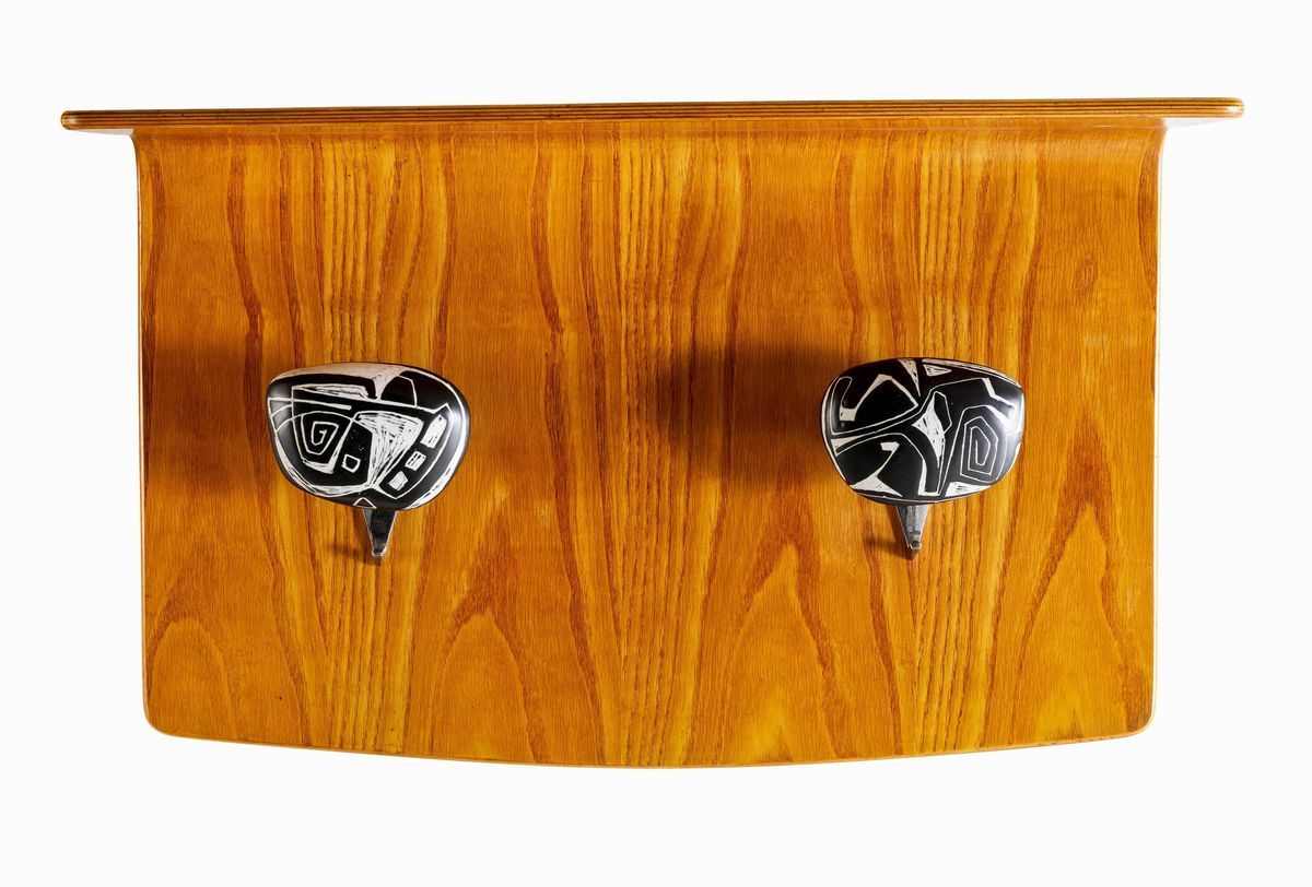Due appendiabiti con struttura in legno compensato curvato ed elementi in metallo e ceramica smaltata realizzati dall'Atelier Victor Cerrato. Marchio a fuoco.