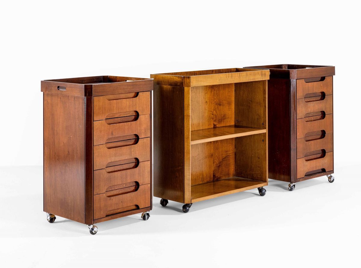 Tre mobili contenitori direzionabili su ruote con struttura in legno, piani a vassoio e cassetti.
