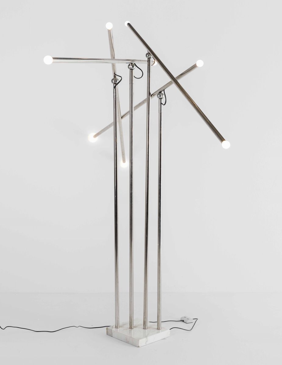 Lampada da terra con base in marmo e steli orientabili in metallo cromato a doppia illuminazione.