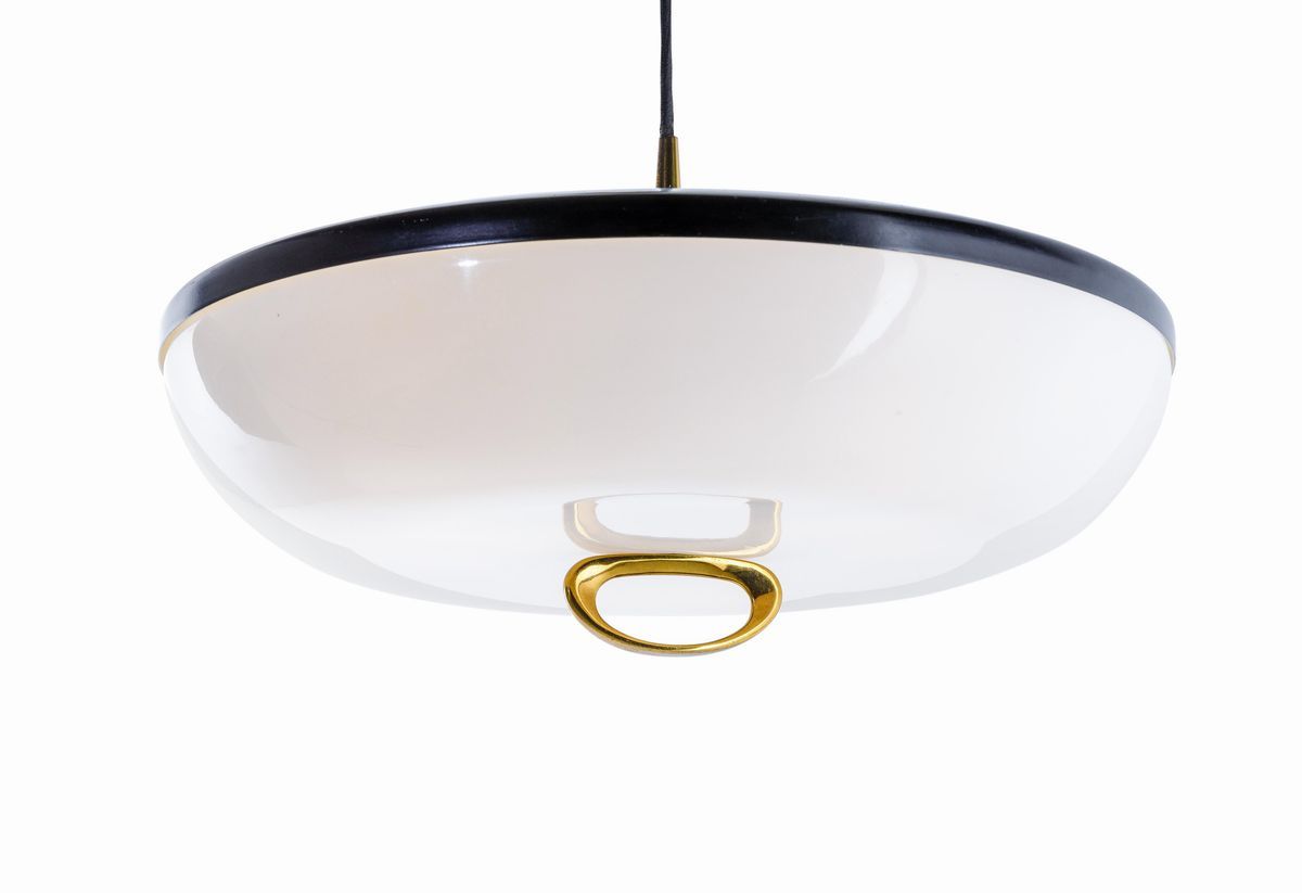 Lampada a sospensione con meccanismo saliscendi. Struttura in ottone e metallo laccato. Diffusore in plexiglass.