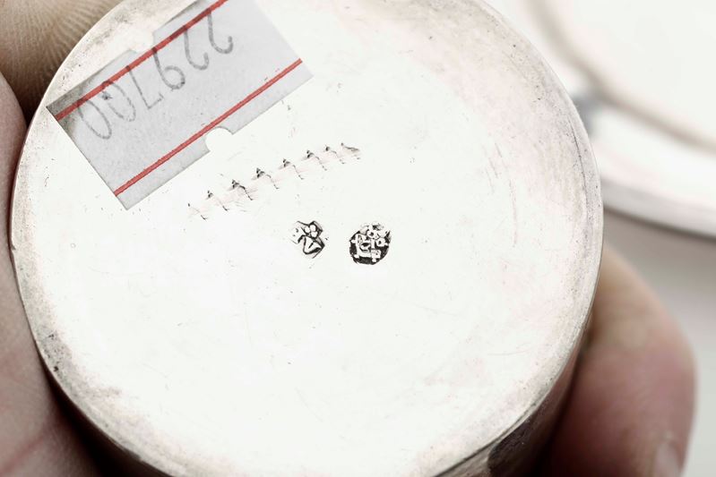 Calamaio in argento fuso, sbalzato e cesellato, Roma XVIII-XIX secolo. Contenitori argentiere Antonio II fumanti (1754-1804). [..]