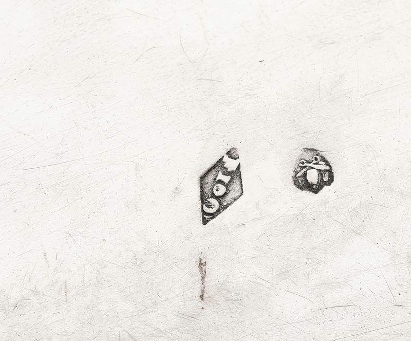 Calamaio in argento fuso, sbalzato e cesellato, Roma XVIII-XIX secolo. Contenitori argentiere Antonio II fumanti (1754-1804). Vassoio argentiere Francesco Sani (1800-1829)