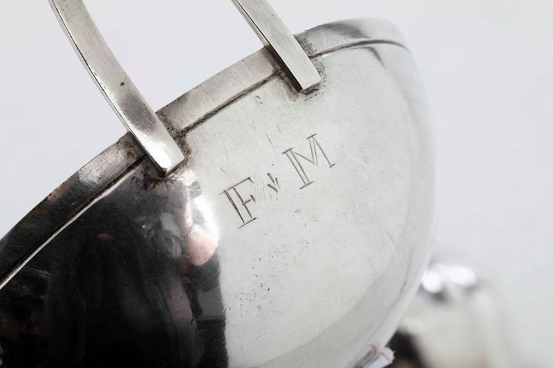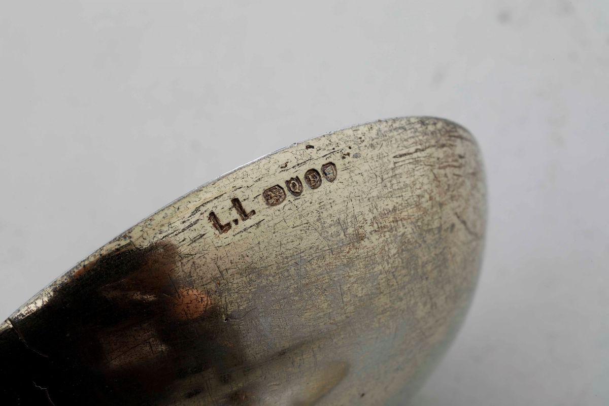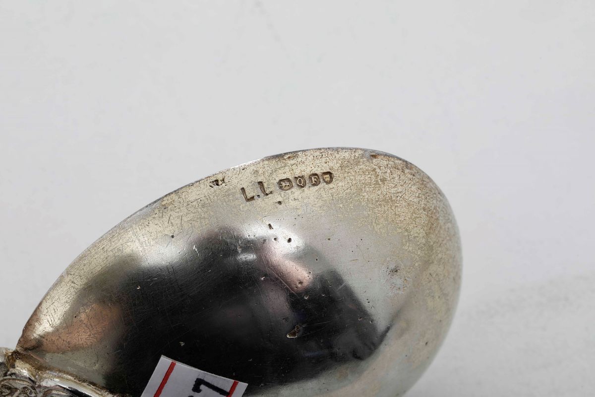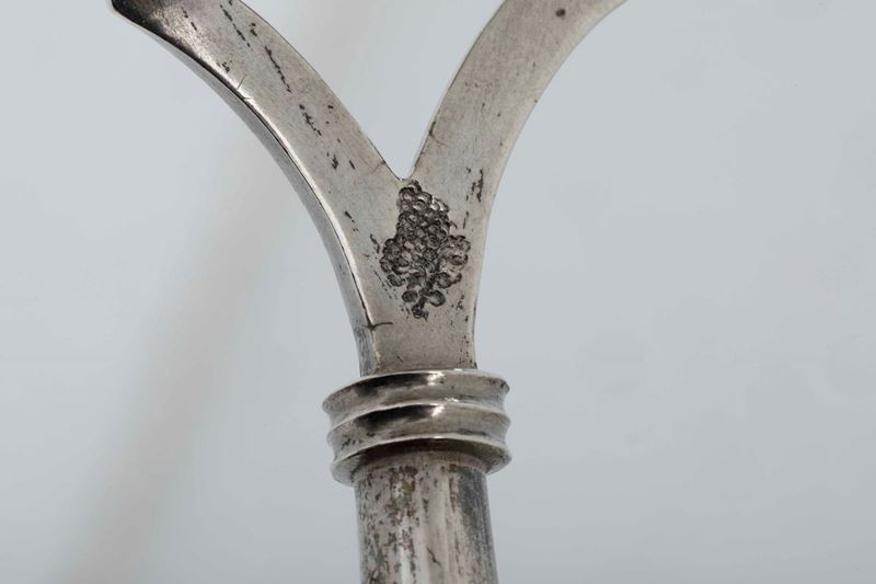 Insieme di tre mestoli da punch in argento (manici in avorio e legno tornito) e due cucchiai in argento vermeille. Varie [..]