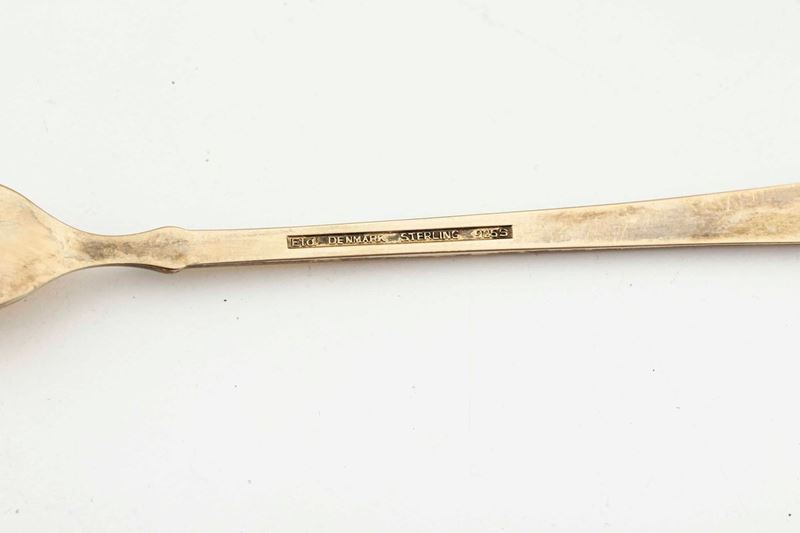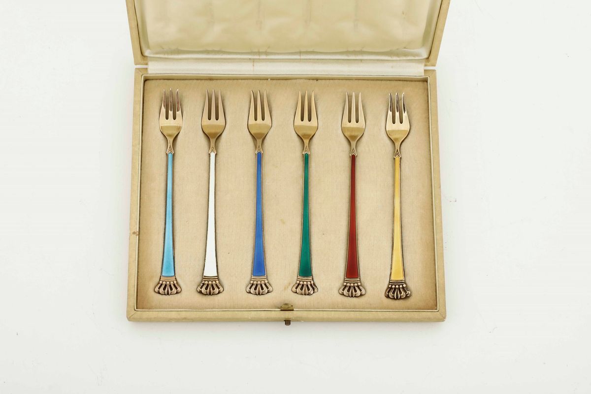 Servizio composto da sei forchettine da dolce in argento dorato e smalti colorati entro custodia. Danimarca XX secolo.