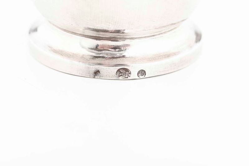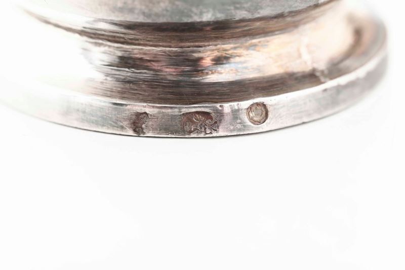 Tre contenitori per olio santo in argento fuso, sbalzato e cesellato. La coppia Genova XIX secolo; l'altro XIX secolo (apparentemente [..]