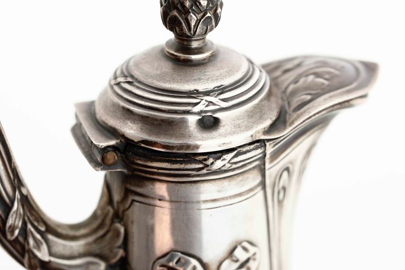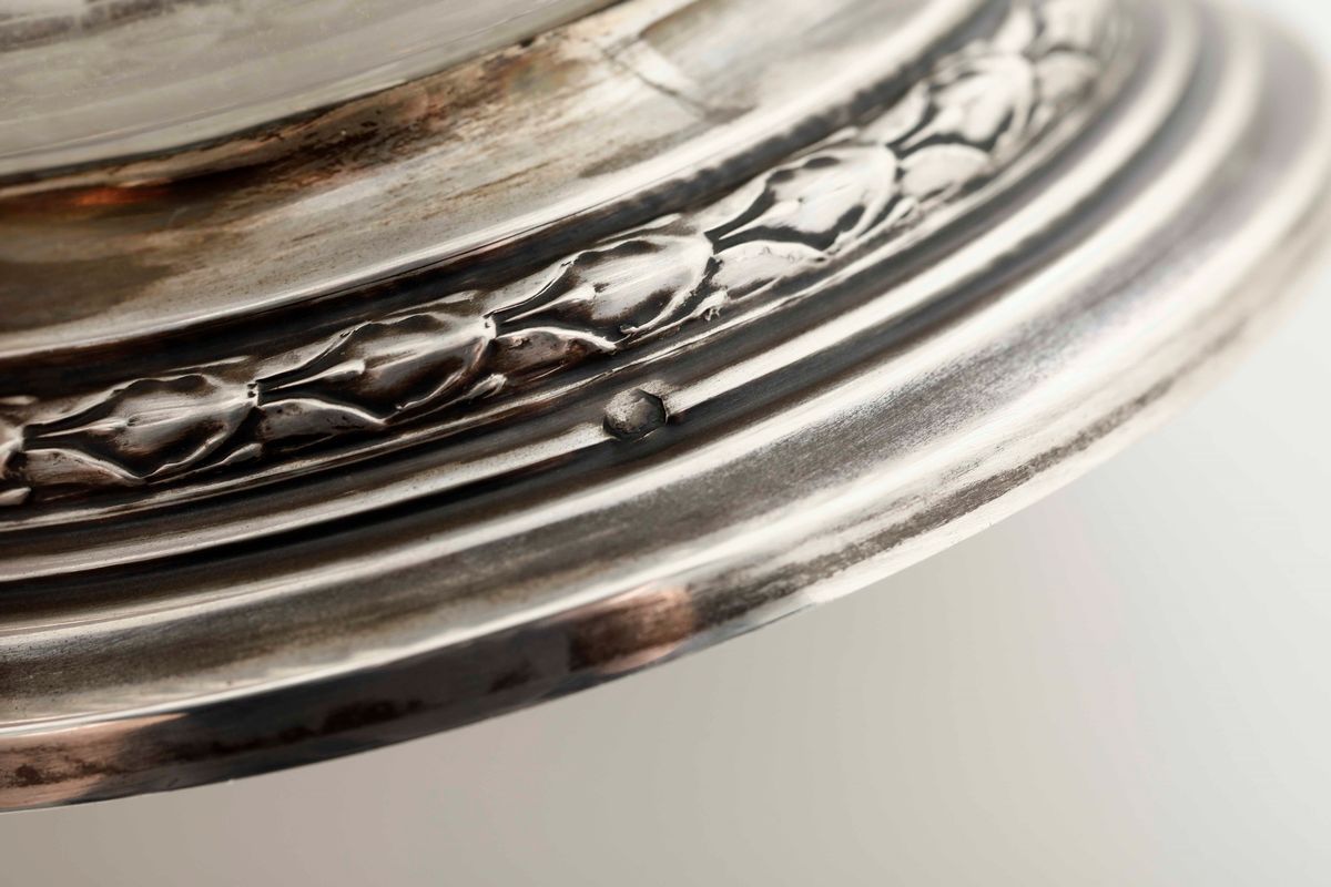 Versatoio in vetro molato e argento fuso, sbalzato e cesellato. Francia XIX-XX secolo