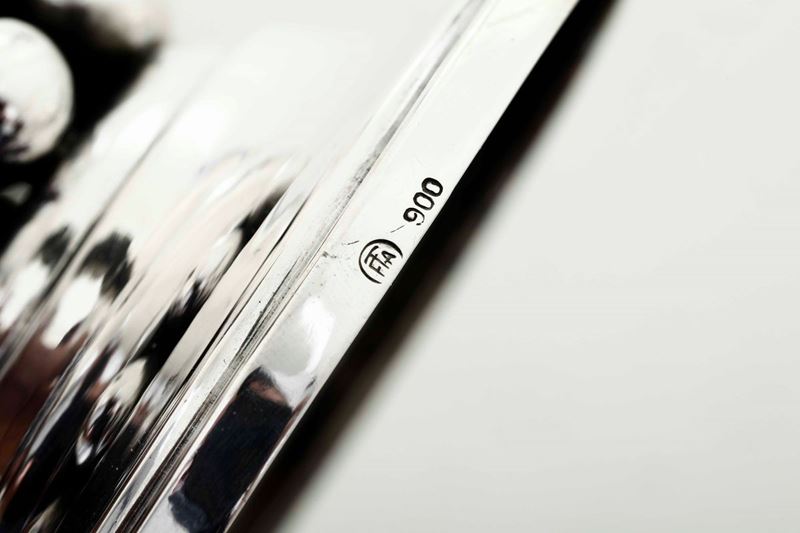 Centrotavola Art Deco in argento 900 con presentoire circolare a specchio. Argenteria italiana del XX secolo. Bollo del fascio littorio in uso dal 1935 al 1945. Argentiere FTA (con presentoire circolare a specchio di manifattura differente)