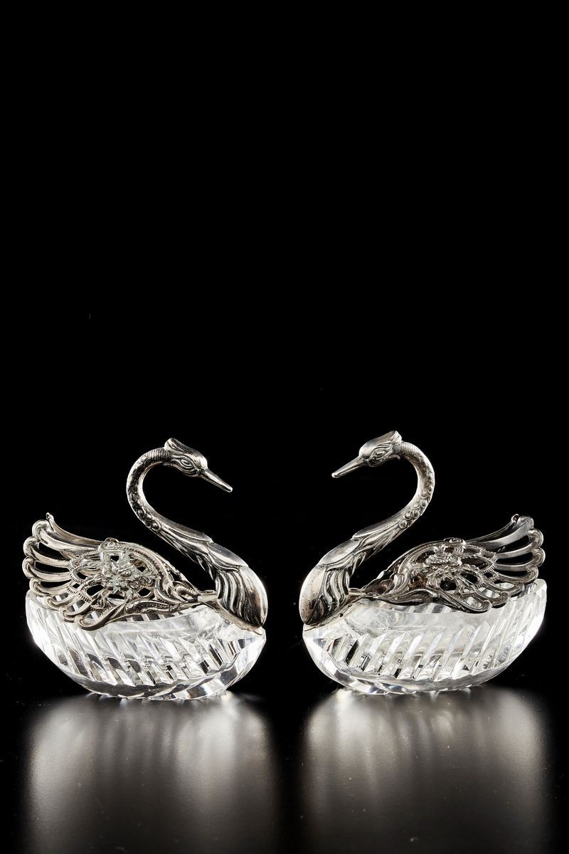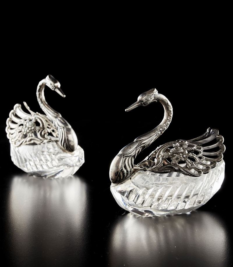 Coppia di saliere in argento e vetro molato a guisa di cigno. Argenteria italiana del XX secolo