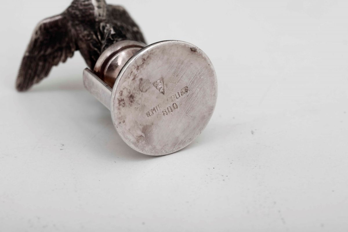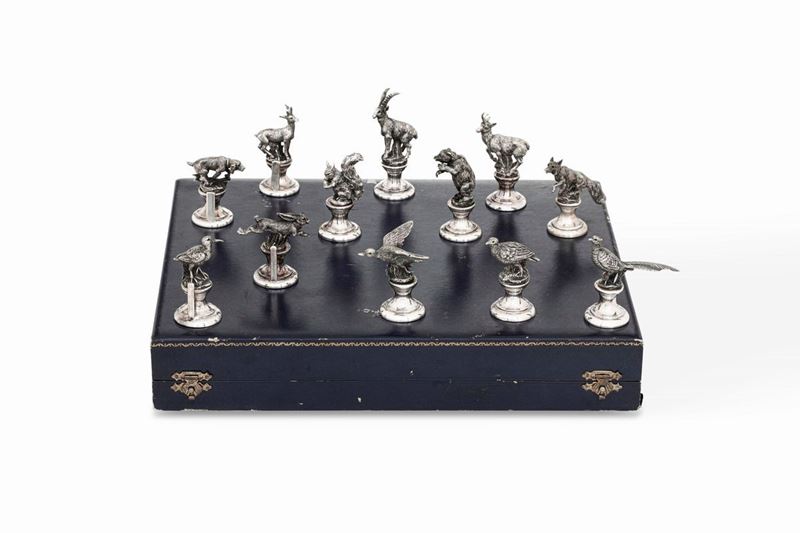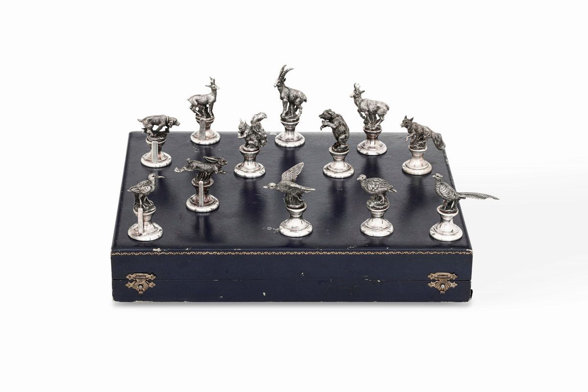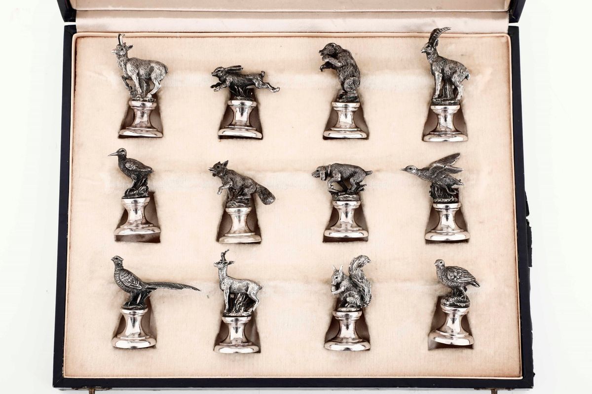 Dodici segnaposti in argento a soggetto venatorio. Argenteria milanese del XX secolo. Argentiere Miracoli
