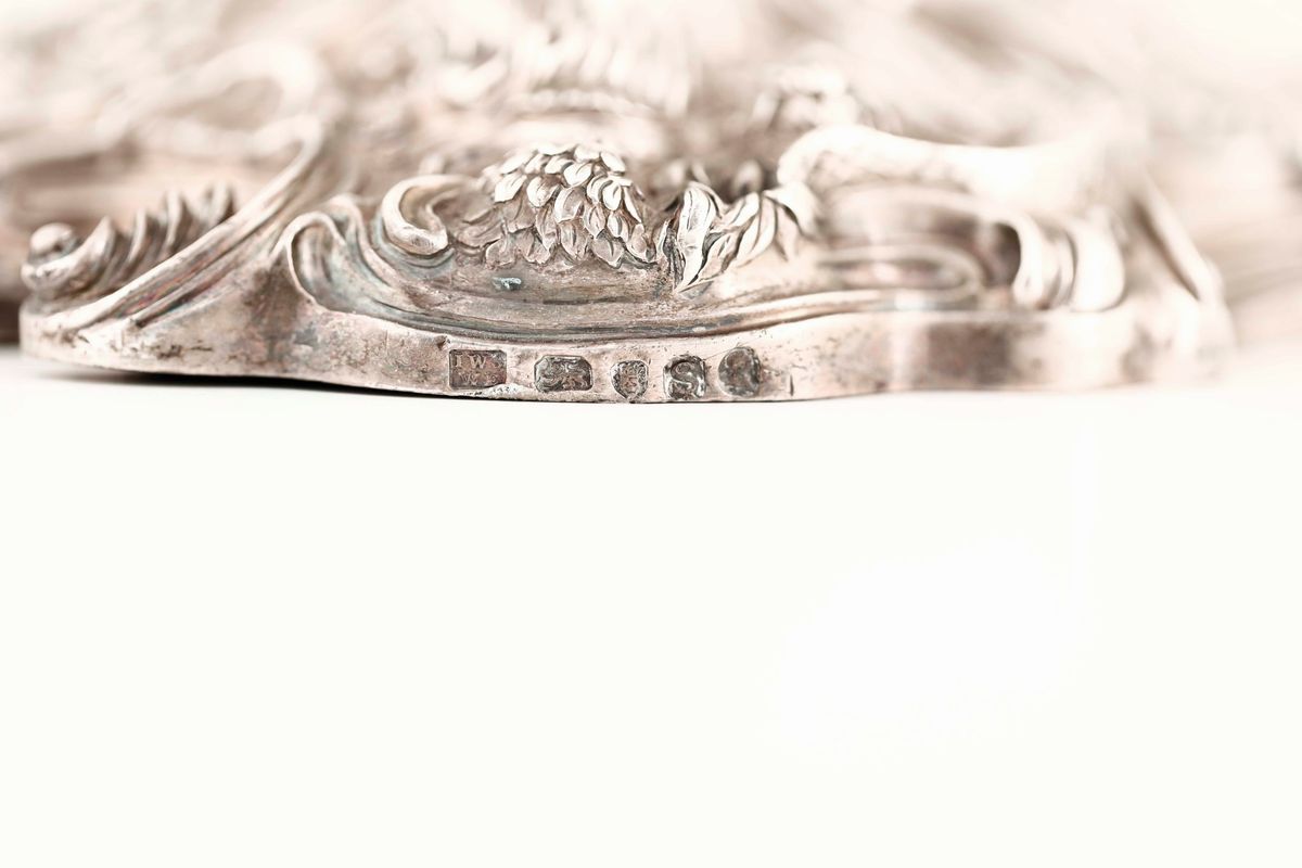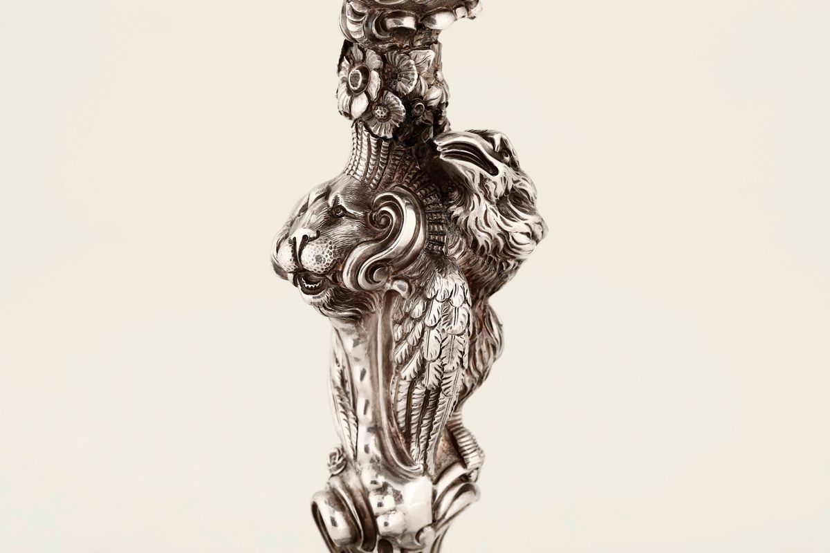 Importante coppia di candelabri in argento Sterling fuso e cesellato. Marchi della città di Londra per l'anno 1813 e dell'argentiere J. W. Storey & W. Elliot