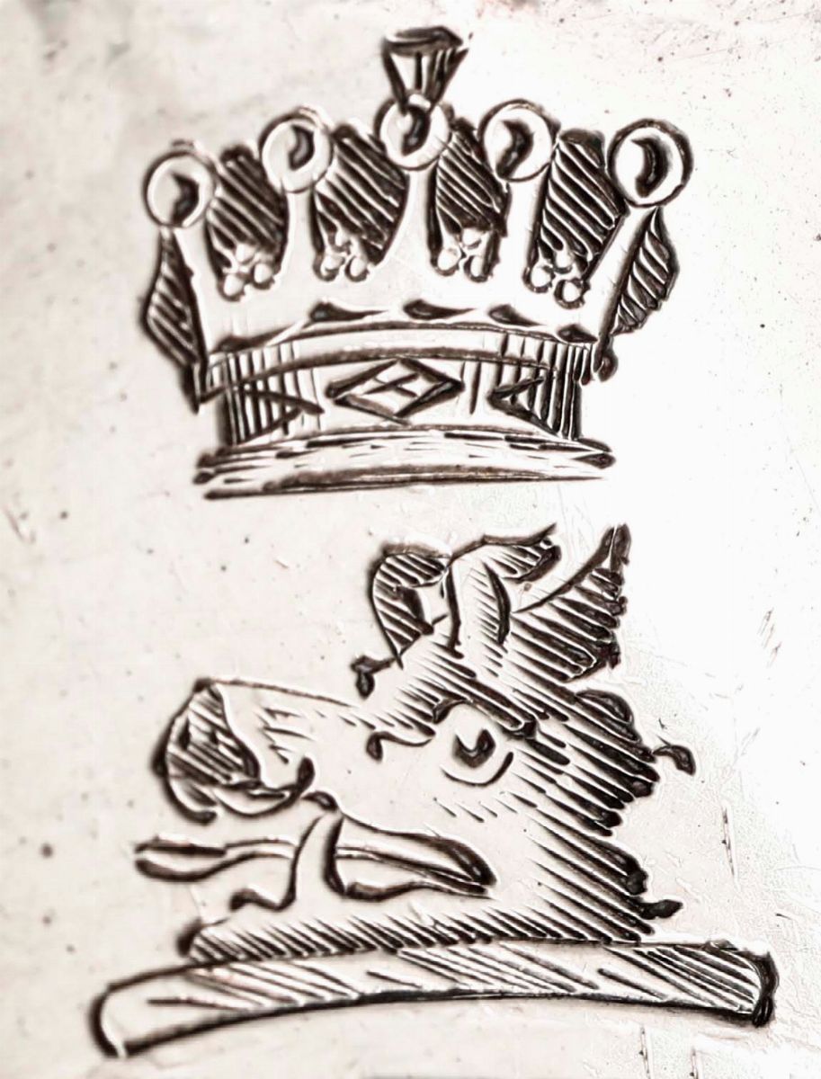 Sulle bobeches elegante incisione raffigurante testa di drago sormontata da corona