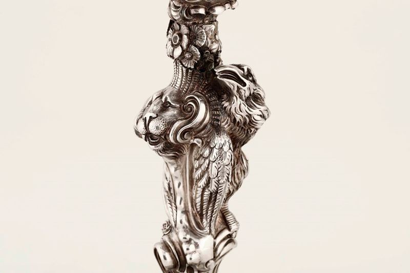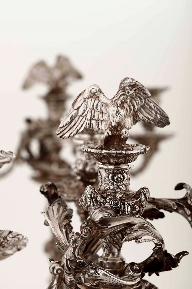Monumentale coppia di candelabri a 4 fiamme magistralmente realizzati a fusione con ricche decorazioni fitoformi a volute e conchiglie. Sulla sommità maestosa figura di aquila reale ad ali spiegate, fusto cinto da figure di testa di aquila e testa di leone affrontate.