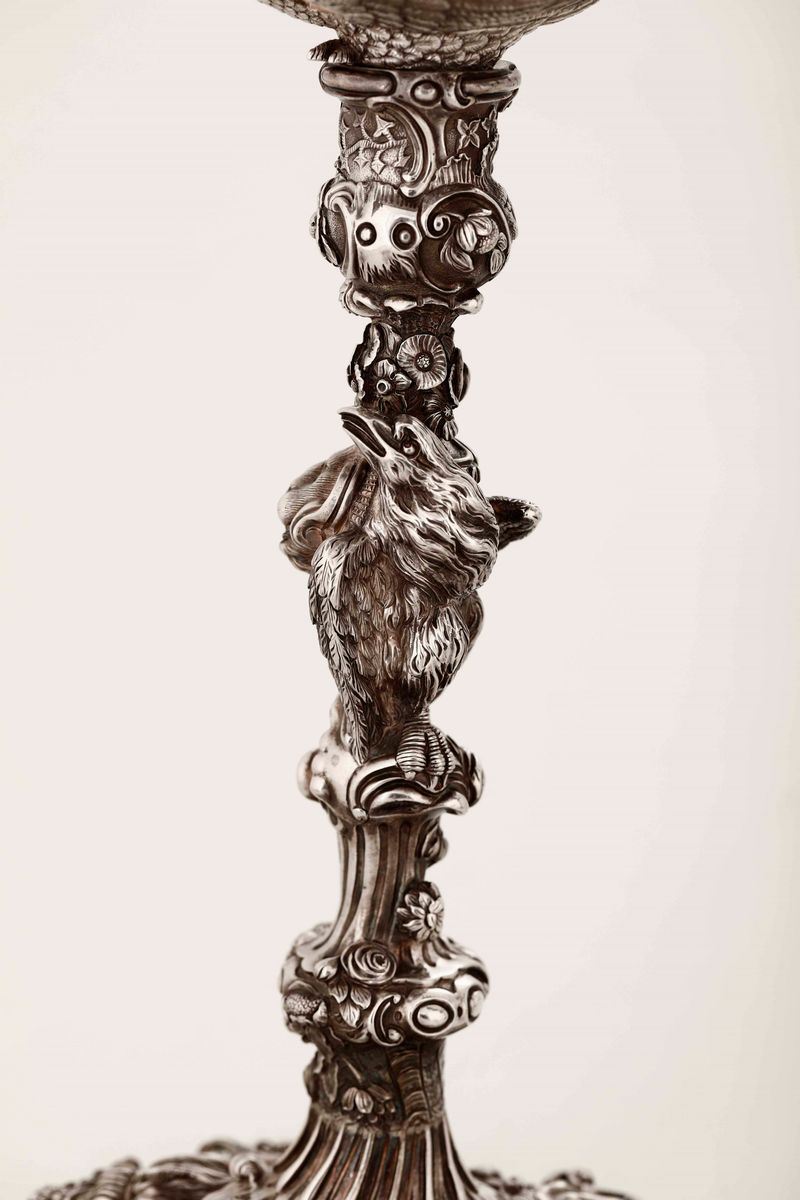 Importante coppia di candelabri in argento Sterling fuso e cesellato. Marchi della città di Londra per l'anno 1813 e dell'argentiere [..]