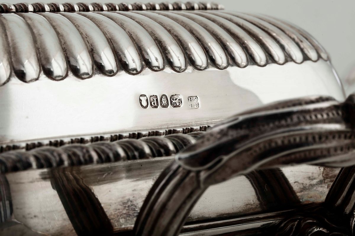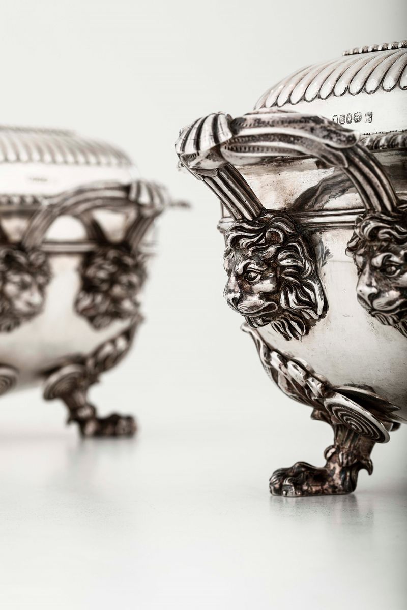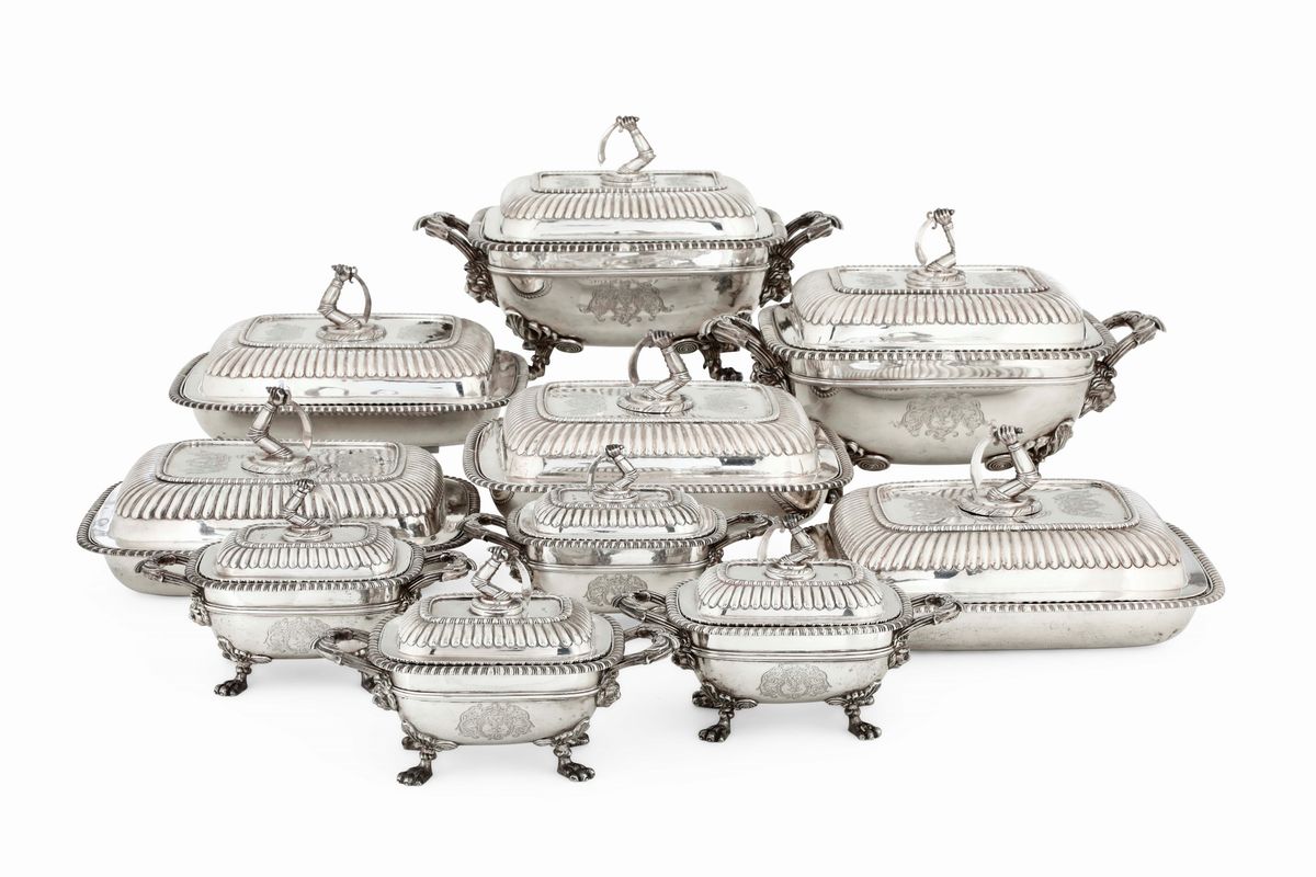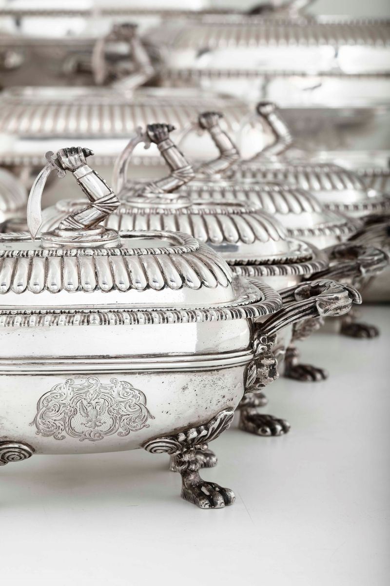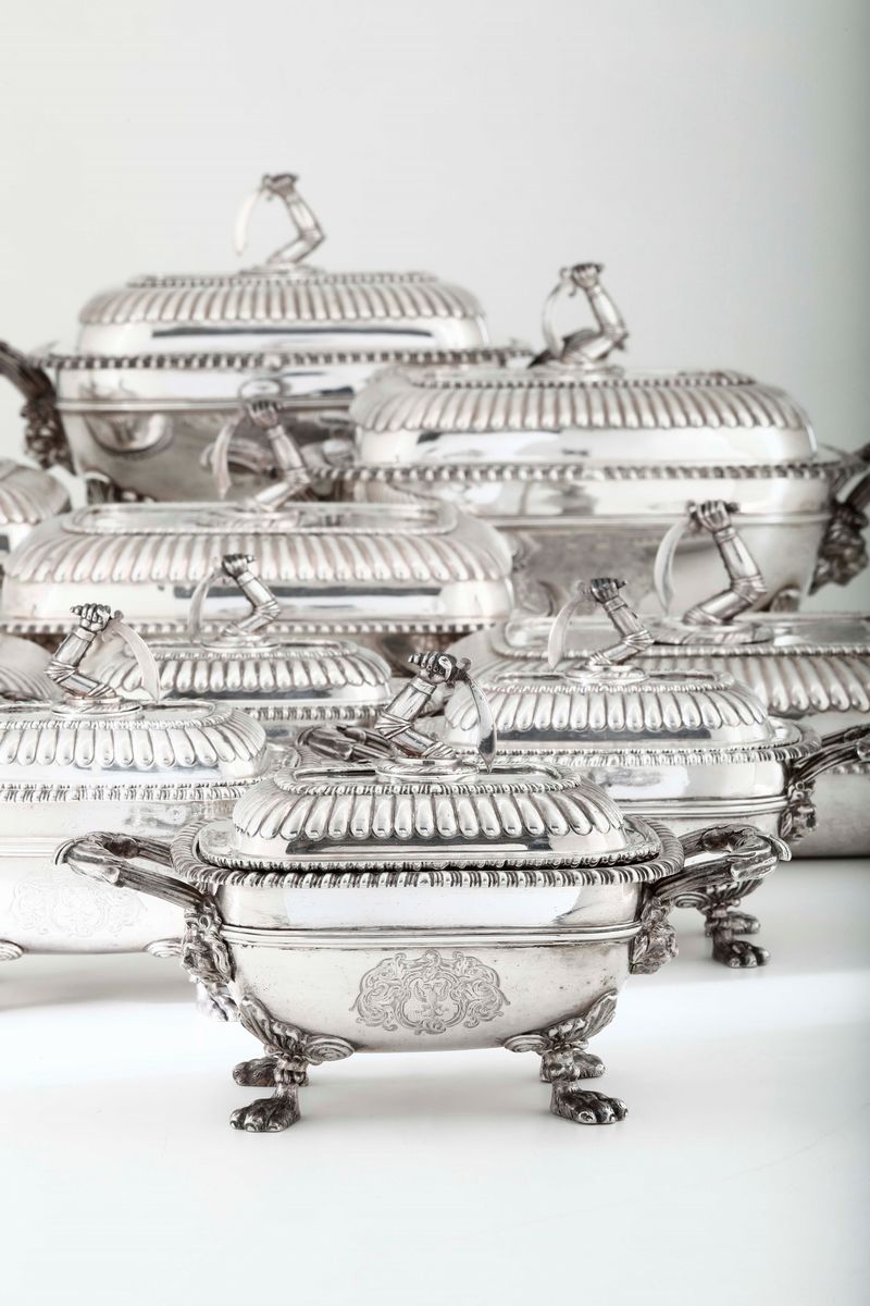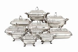 Importante e raro insieme composto da due zuppiere, quattro legumiere e quattro salsiere in argento Sterling fuso e cesellato. Inghilterra inizi del XIX secolo. Marchi della città di Londra per l'anno 1810 e dell'argentiere R. & S. Hennell