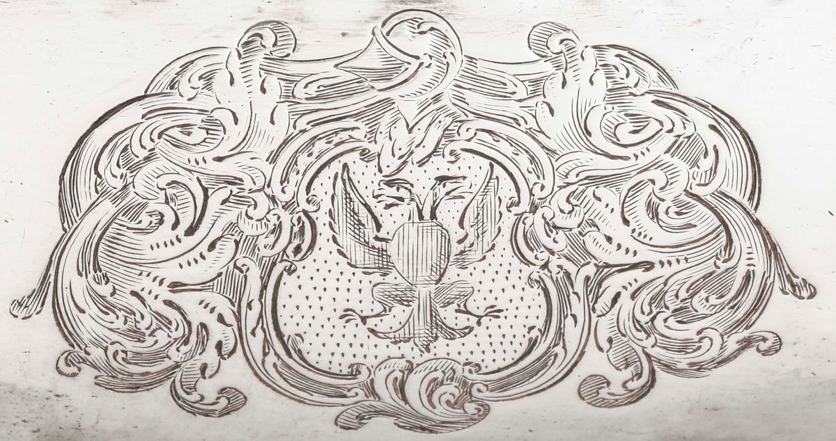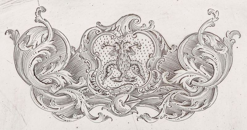 Ogni oggetto reca uno stemma nobiliare inciso a cesello con aquila bicipite entro elaborata decorazione a volute