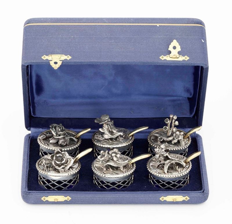 Sei saliere in argento fuso, traforato e cesellato e vetro blu cobalto. Argenteria artistica milanese del XX secolo. Argentiere [..]