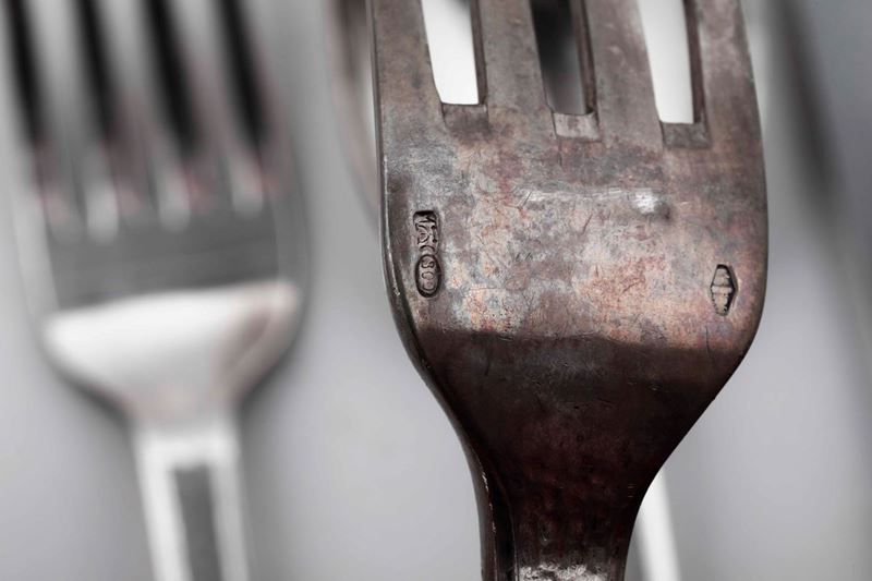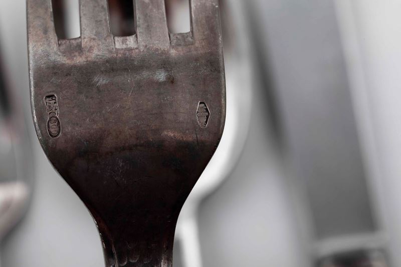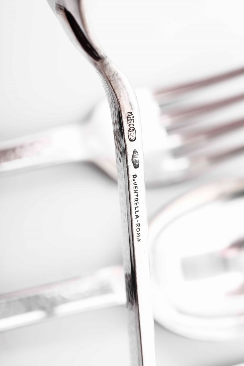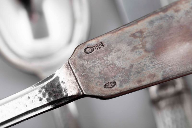 Servizio di posate in argento modello Decò. Argenteria italiana. Bollo con fascio littorio in uso dal 1935 al 1945. Argentiere Clementi, Bologna