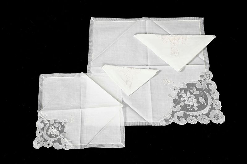 Dimensioni: tovaglia cm 285x162; tovaglioli cm 45x45; tovagliolini cm 29x29. Conservazione: buona; 1 tovagliolo e 1 tovagliolino macchiati