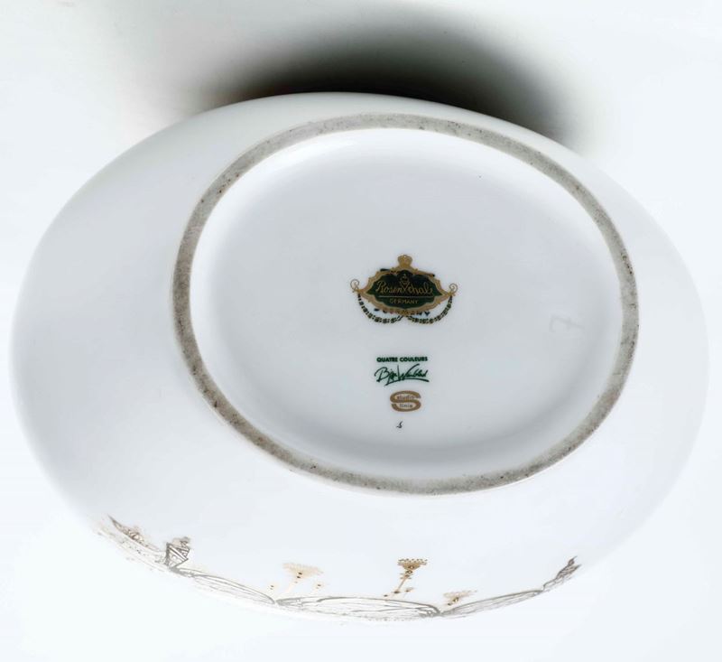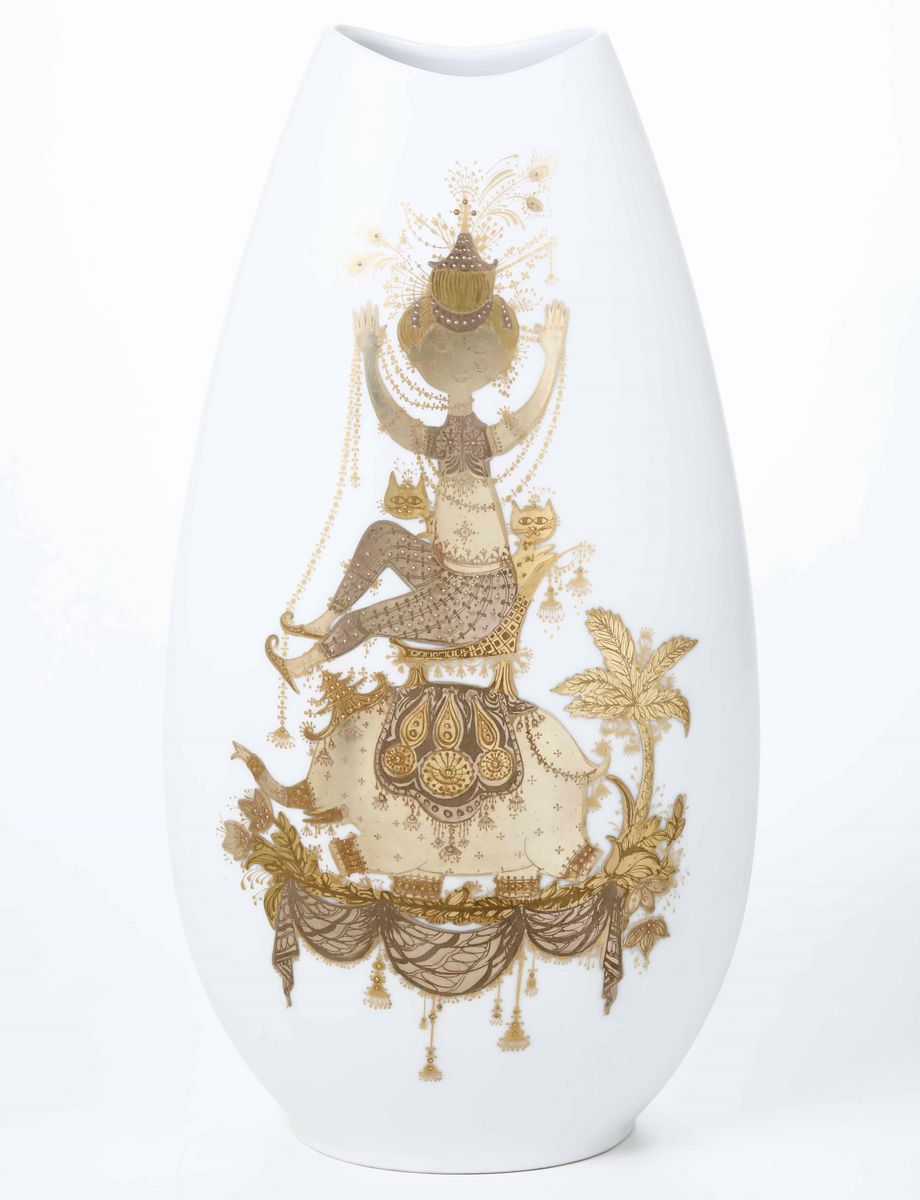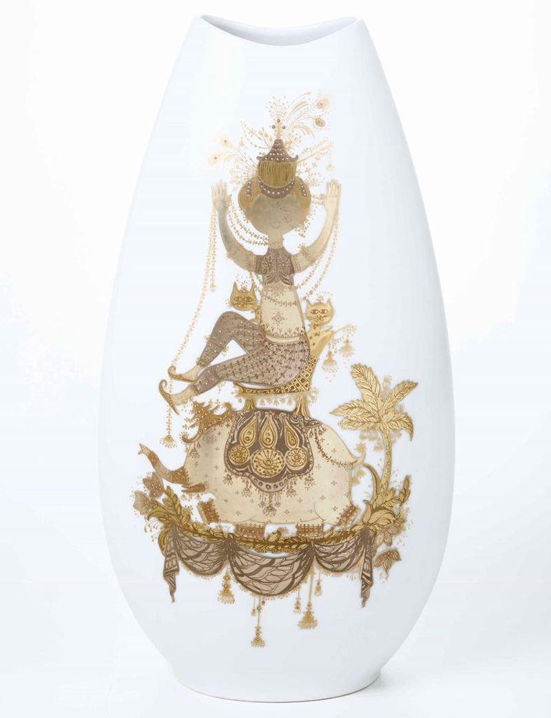 Porcellana. Marca: "Rosenthal Germany" in cartiglio verde e oro; "Quatre couleures Bjorn Wiinblad" in verde; "Studio Linie" in oro. Altezza cm 44,1. Conservazione: ottima