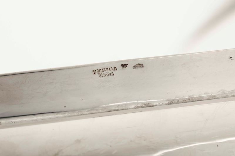 Vassoio in argento fuso e cesellato. Argenteria italiana del XX secoll. Argentiere Gianni Pietrasanta & C. per Codevilla Genova