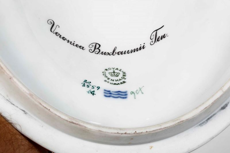 Porcellana. Marca: onde in blu; "Royal Copenhagen Denmark" in verde. Dimensioni: altezza cm 23,9; cm 33,4x20,8. Conservazione: ottima