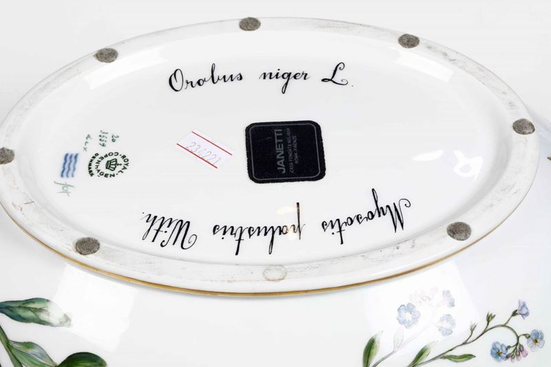La zuppiera, dalla forma ovale, ha i manici e la presa del coperchio modellati a ramoscelli fioriti ed è dipinta con le specie botaniche menzionate sul verso in caratteri latini in nero