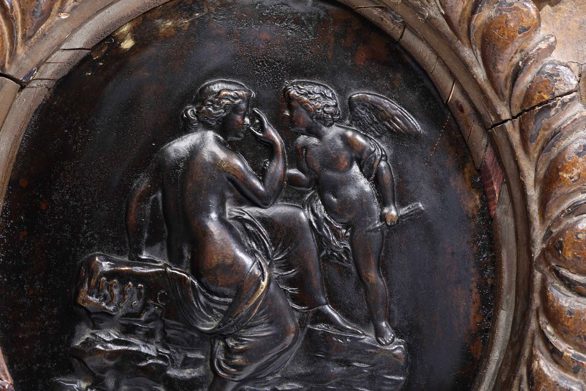 L’importante placca realizzata a cera persa ripropone il tema della classicità Greca, cara all’arte rinascimentale, di Venere e Amore, e raffigura la dea seduta su una roccia che sembra redarguire un vivace Heros.
