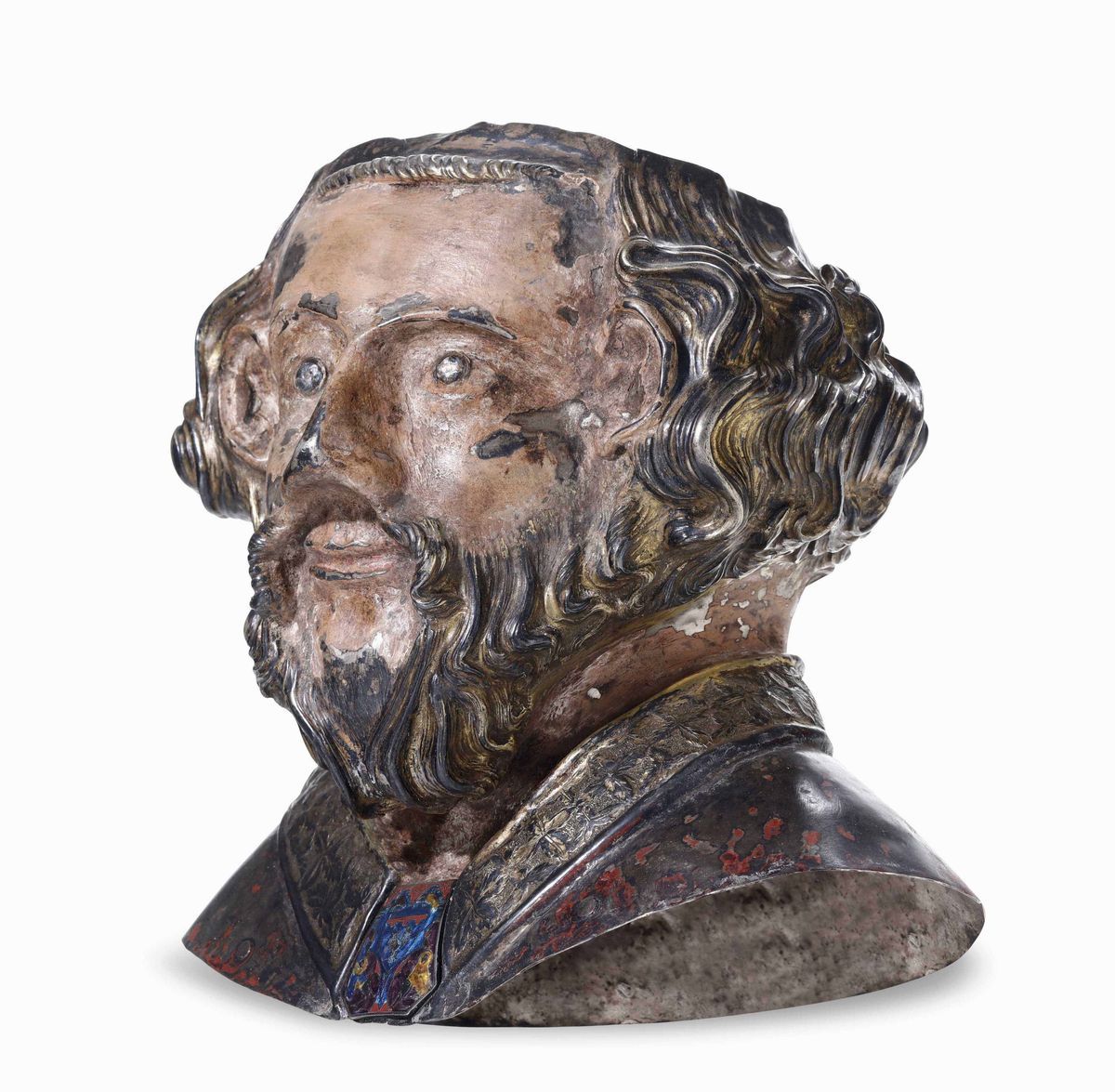 La rara testimonianza di oreficeria tardo gotica raffigura la testa di un Santo con la barba e dai capelli che scendono a larghe ciocche incorniciano la vivace espressività del volto illuminato dai grandi occhi spalancati, e con le spalle ricoperte da un mantello rosso ornato da un prezioso collare con decori a foglie di vite chiuso da una raffinata fermatura contenente uno stemma. La parte superiore della testa era con ogni probabilità terminante con un copricapo che fungeva anche da opercolo per accedere alla reliquia contenuta entro la cavità. I modelli stilistici dell’opera rimandano ai modi della scultura tardo gotica che si sviluppa in quell’aria territoriale tra la regione Catalana, i Pirenei e il sud della Francia, zona in cui erano attive già dal medioevo due importanti centri per la produzione di oreficeria e smalti come Limoges e Barcellona.