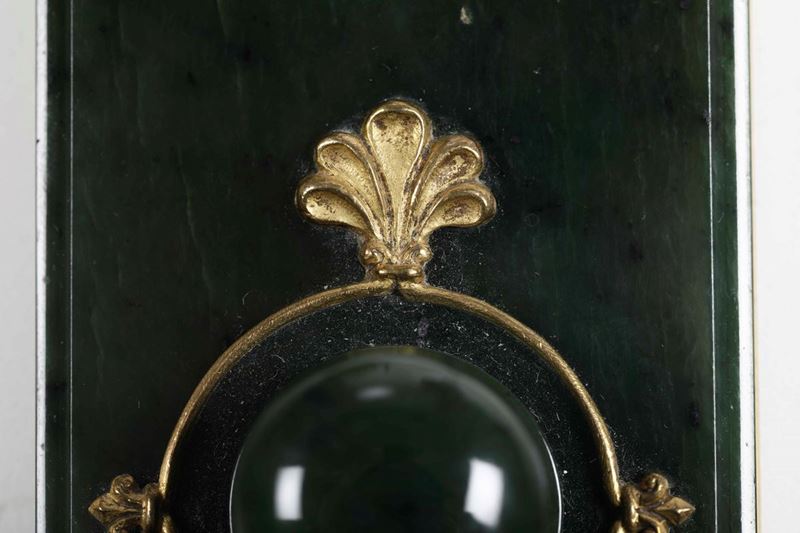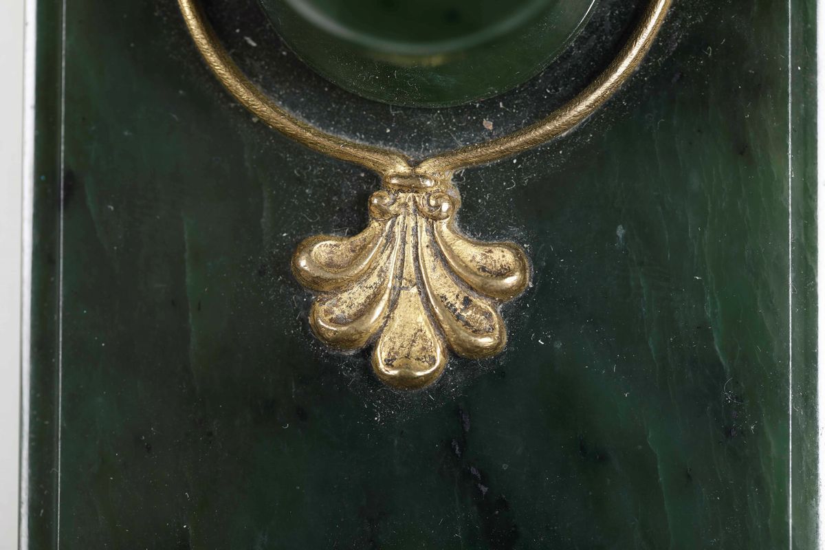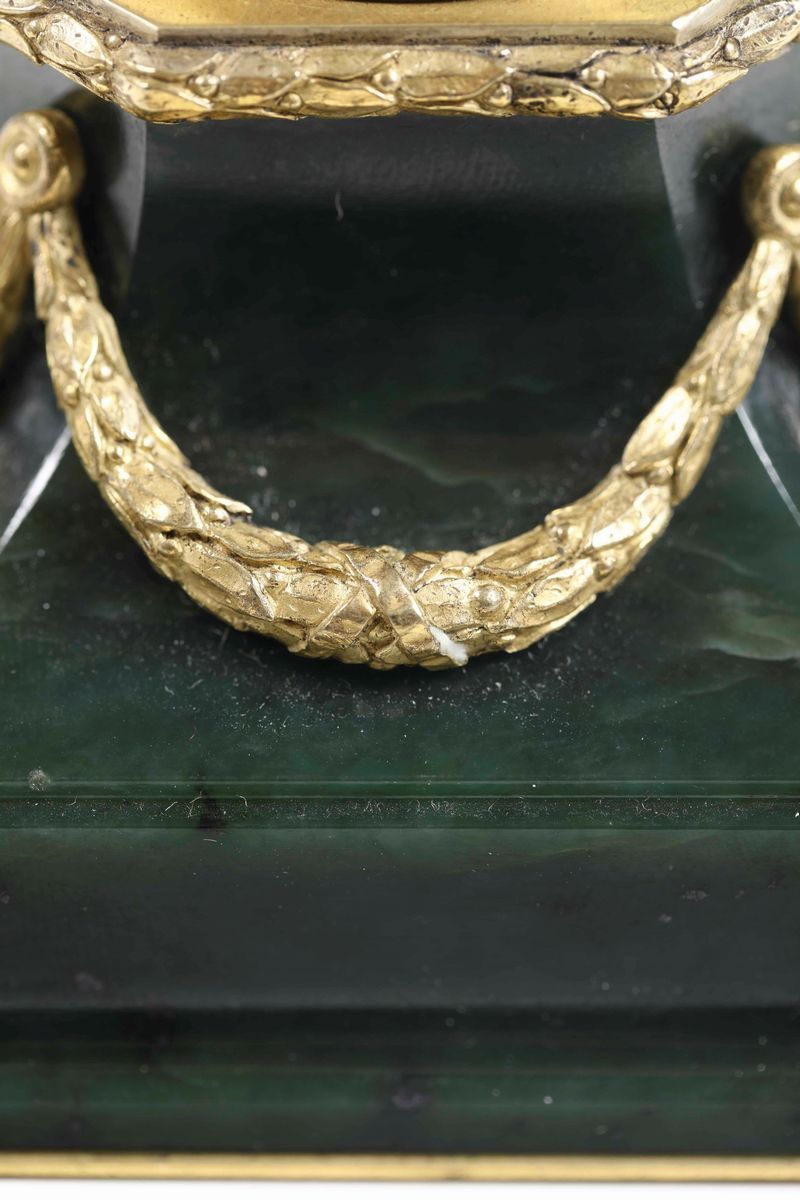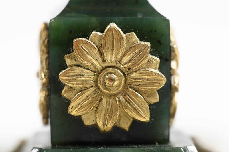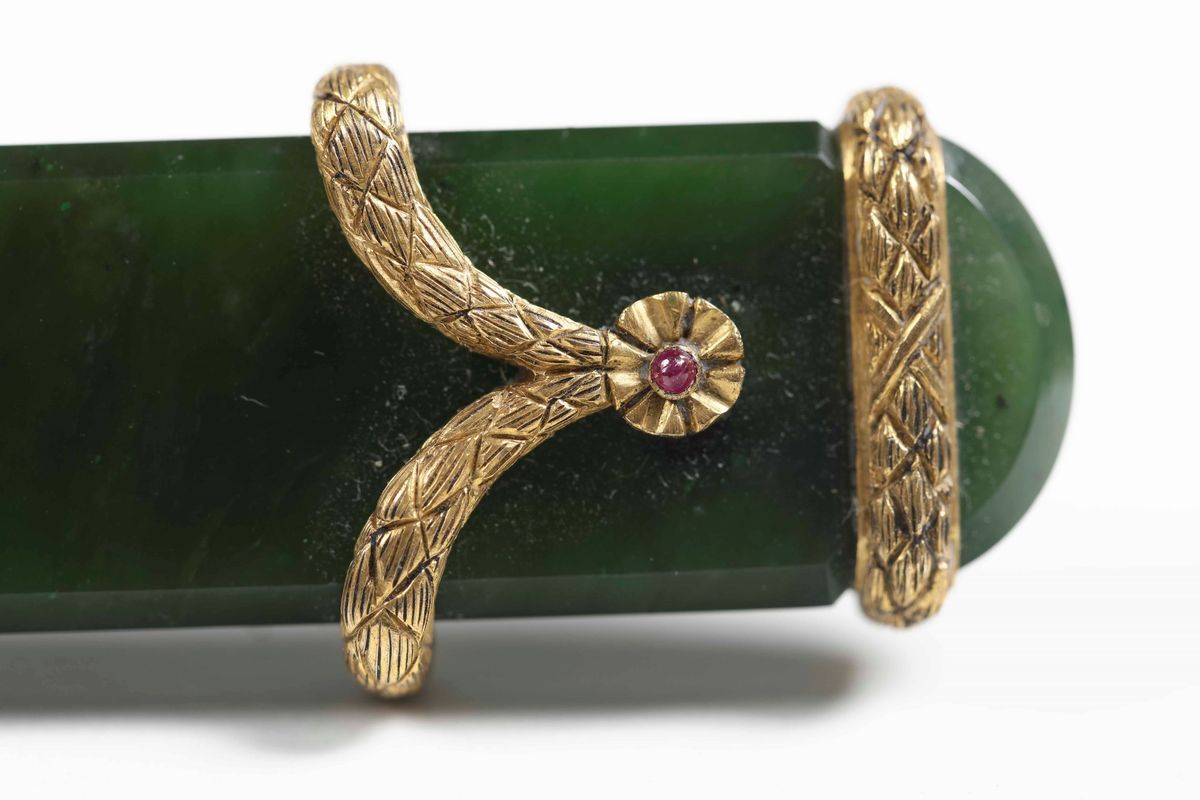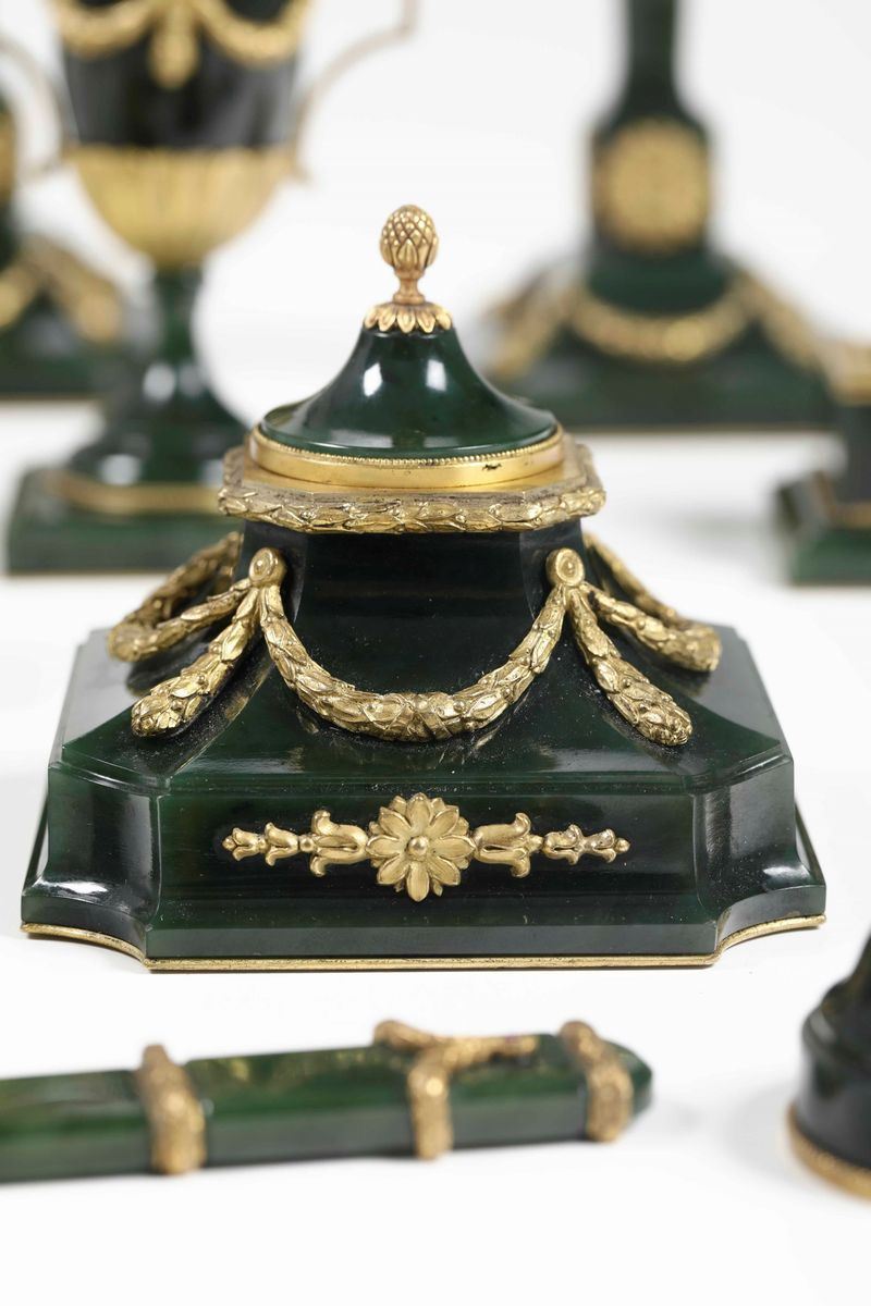 Nephrite and molten, chiselled, gilt bronze with Cabochon stones. 10 piece set.