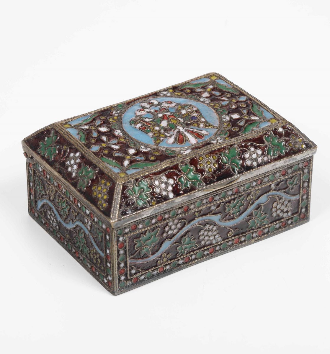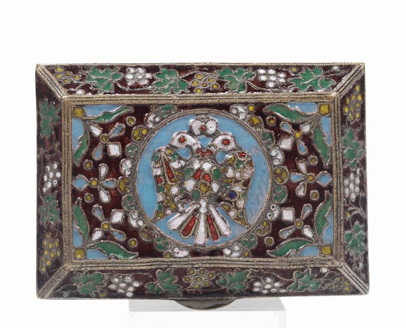Silvered metal with polychrome enamels. 13x9.2x6.5cm