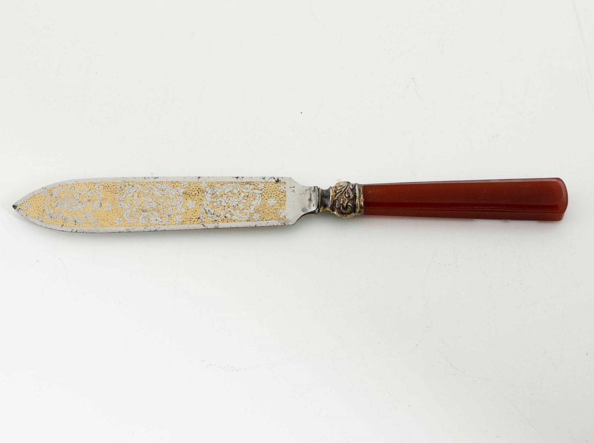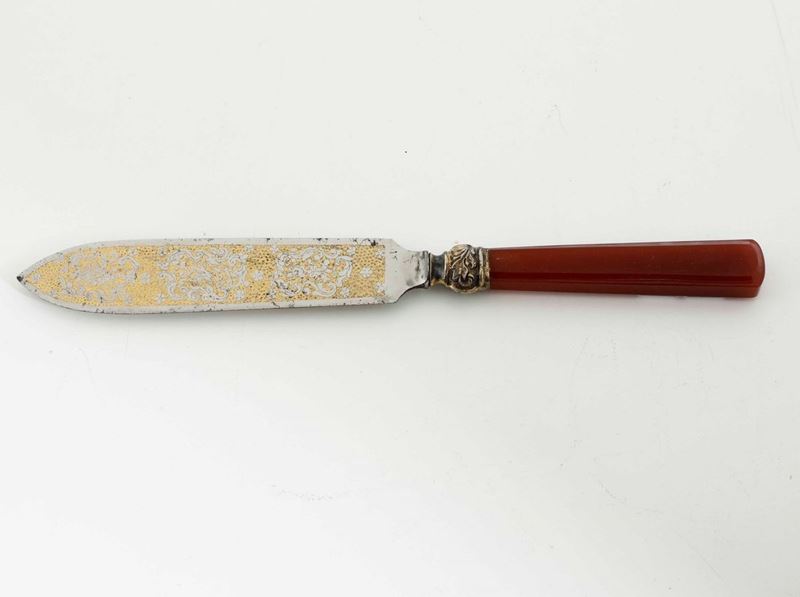 Damasked and gilt metal, red carnelian handle, within its original green leather case.