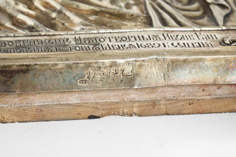 Embossed, chiselled and gilt silver riza. Assayer A. Svetschin, unidentified silversmith's mark. 27x22cm