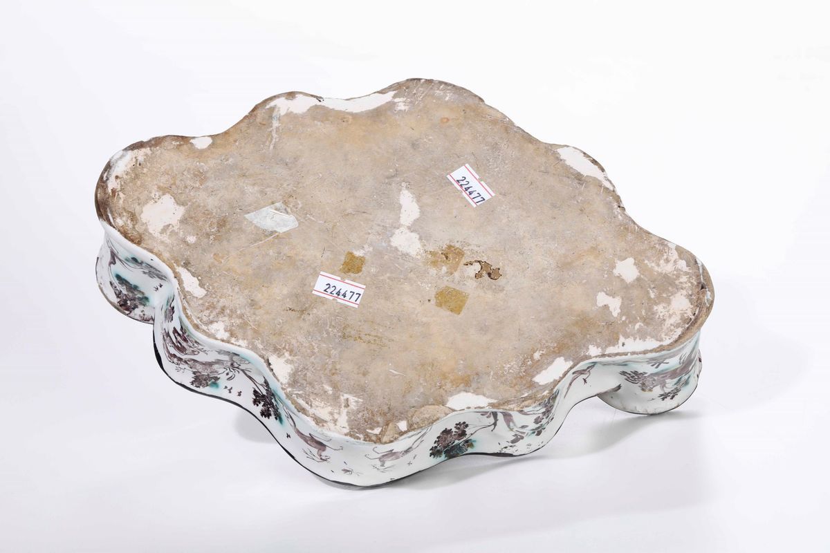 Maiolica a gran fuoco. Marca assente. Dimensioni: altezza cm 12; cm 28x19. Conservazione: sbeccatura al bordo superiore e sbeccature minori